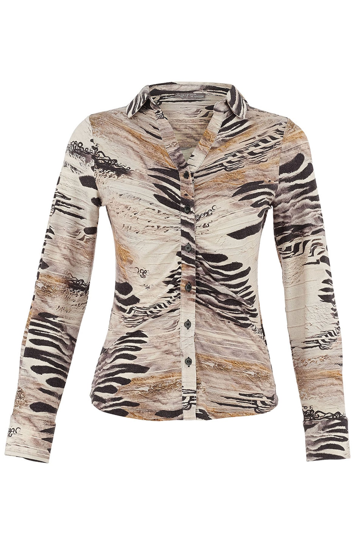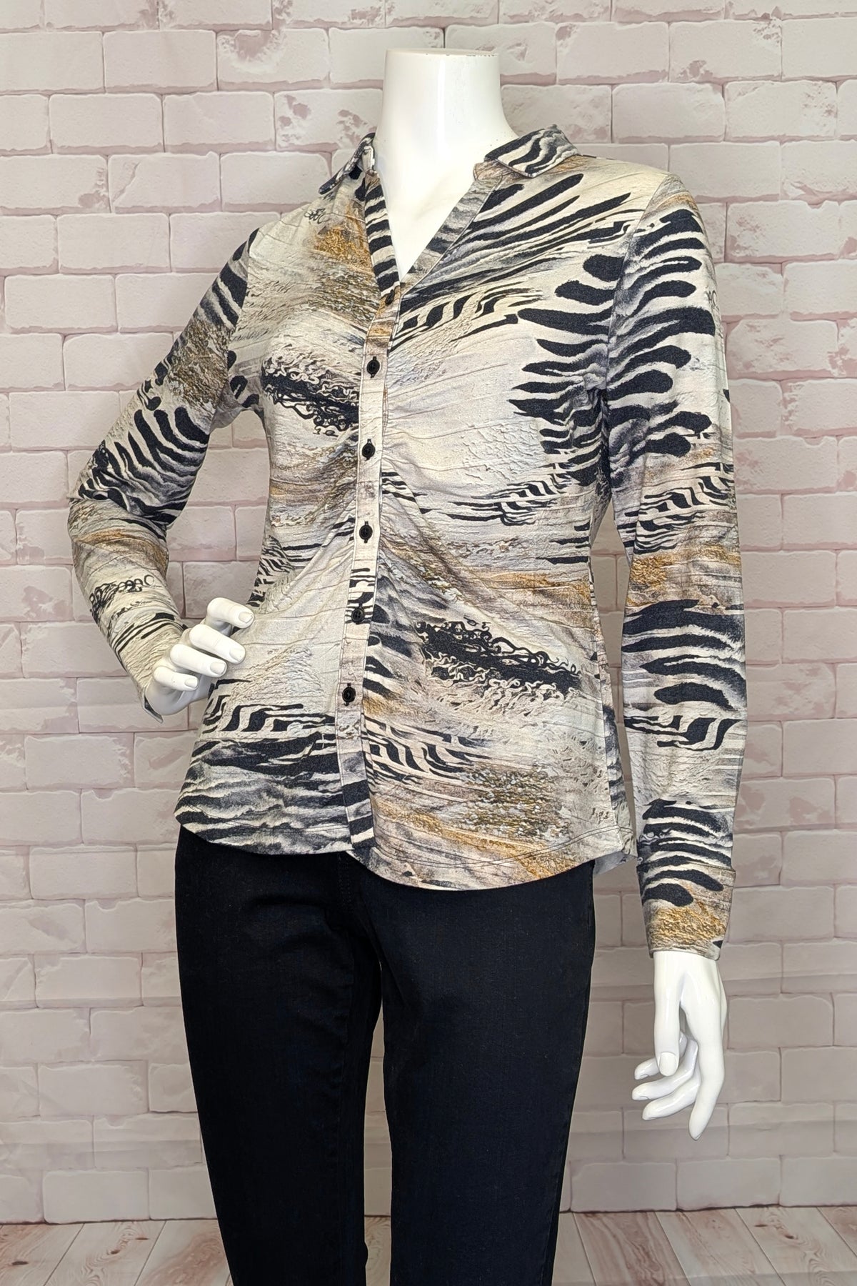 Discover the versatility of this new fall blouse! The open 'Y collar' and gathered front detail add a unique touch to this different type of blouse. Made from soft knit jersey fabric, it features front buttons and a curve hem. Pair with dark blue jeans for an effortless, stylish look!