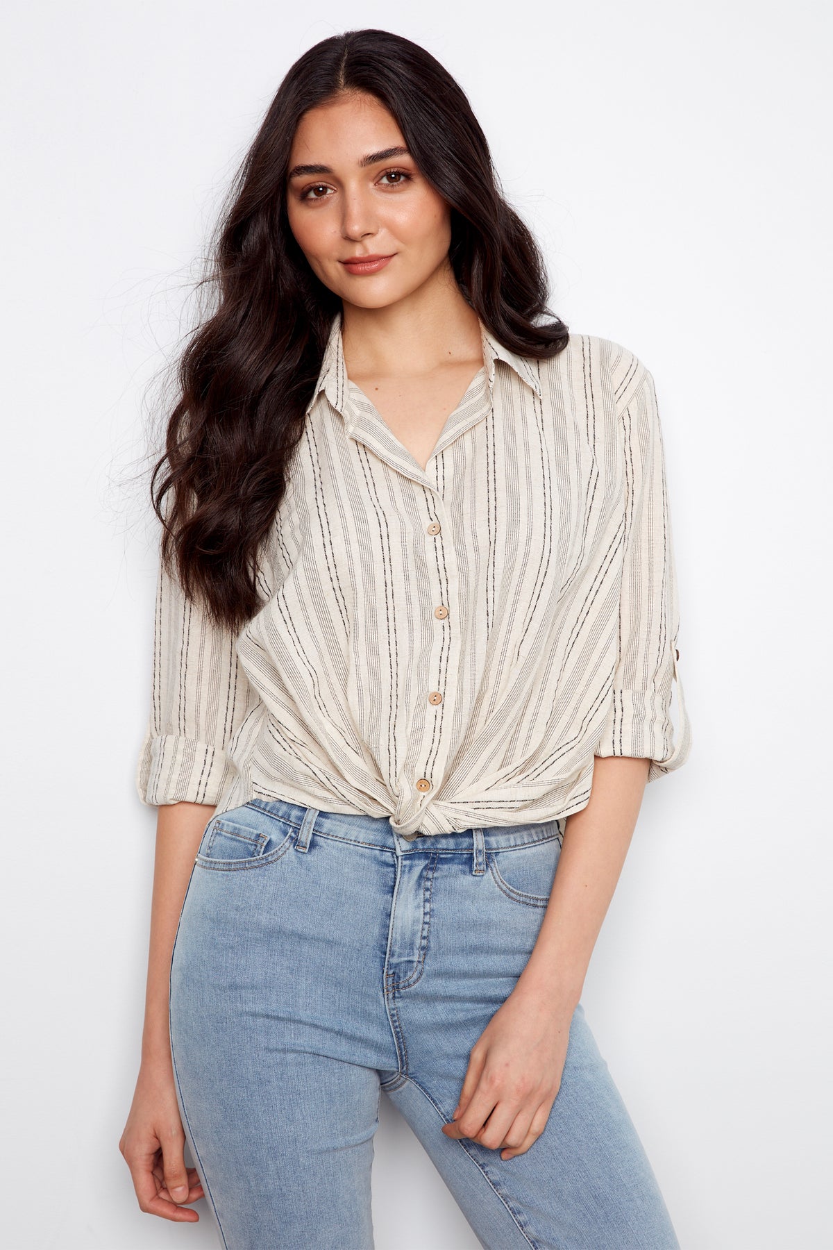 Woman wearing a striped blouse and jeans against a white background