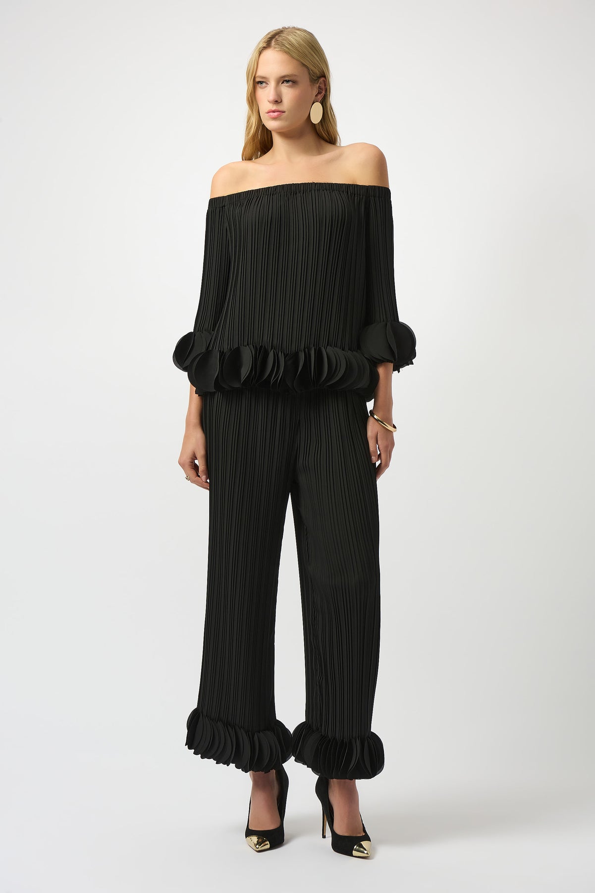 These black pleated pants feature delicate ruffled details and distinctive circle accents along the hems, lending a refined and elegant touch. The elastic waist ensures a comfortable yet flattering fit, while the flowing, lightweight fabric offers effortless movement. Pair them with the matching top for a polished and cohesive ensemble perfect for sophisticated occasions.