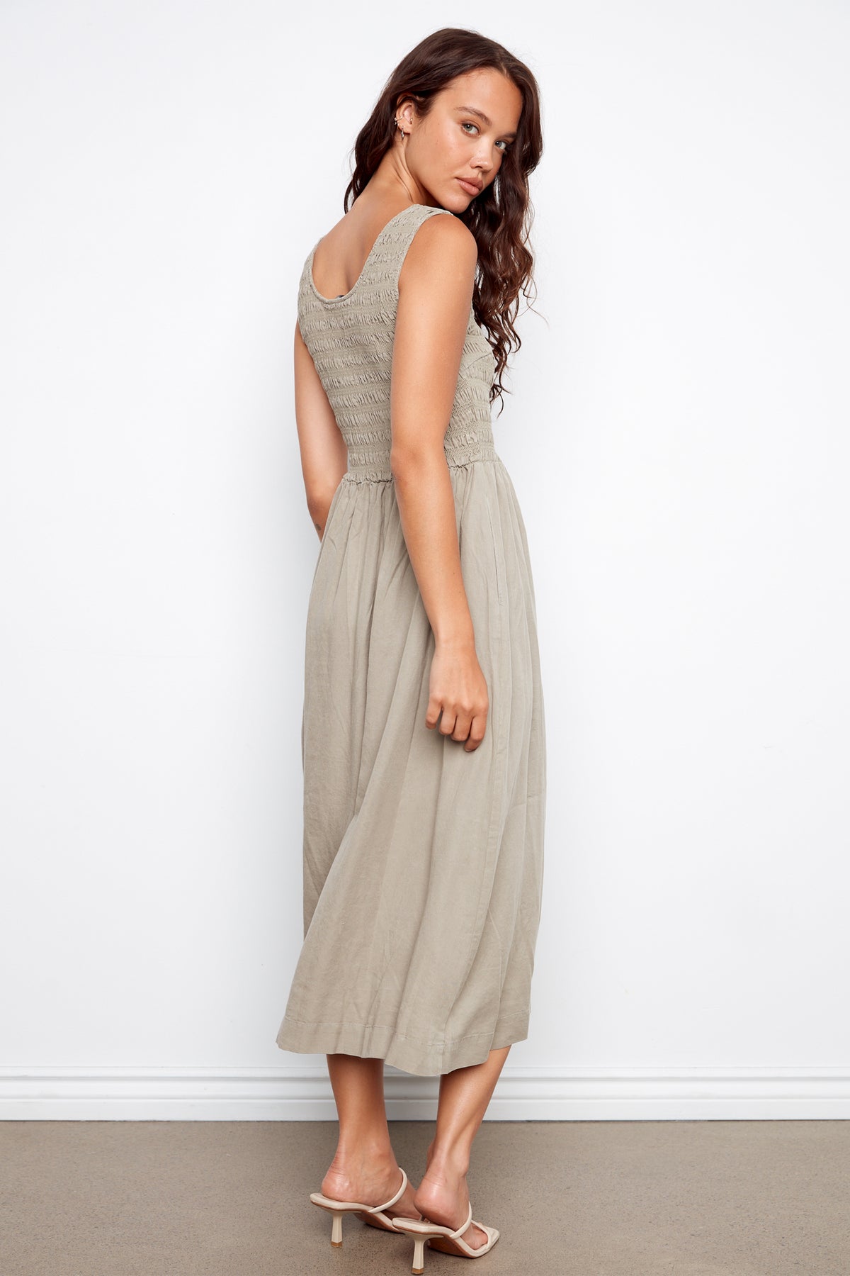 SAGE SLEEVELESS SMOCKED BODICE DRESS