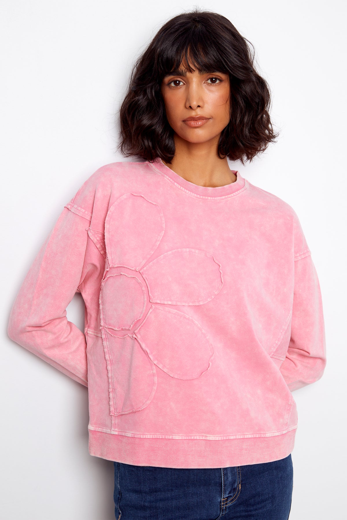 Elevate your casual wardrobe with this long-sleeve sweater, featuring an artfully placed flower applique that adds understated sophistication. The expertly crafted washed-out, faded finish delivers an effortlessly vintage aesthetic while maintaining a polished appearance. Constructed for comfort and versatility, this piece transitions seamlessly from weekend errands to relaxed social gatherings. The muted colour palette and delicate floral detail create a refined look that works beautifully layered or worn solo.