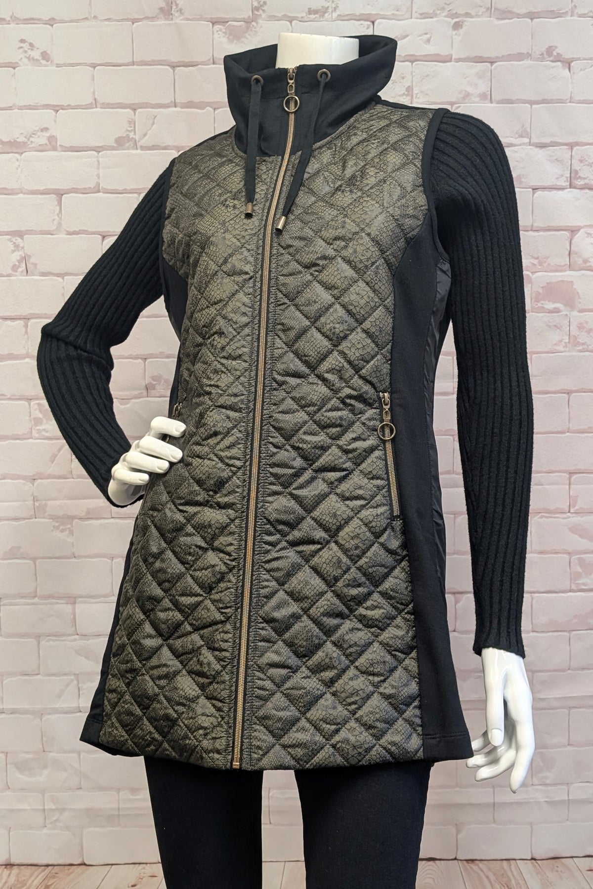 Everyone loves a quilted vest! This quilted matte long vest comes in black and a contrast front snake print, featuring a high contrast collar with drawstring, front zipper closure, side zip pockets and with a fitted silhouette overall. Goes great with leggings or joggers to give you a sporty yet sleek look this season.