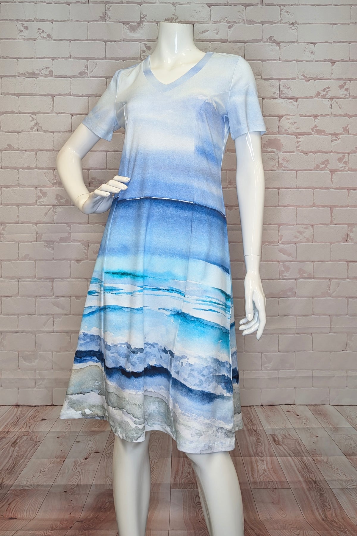 This all new short sleeve summer dress features an all-over seascape print, creating a unique and eye-catching watercolour design. Made for easy wear with its pull-on style, the dress also includes short sleeves with a soft cut v-neck design for added style. Its flare figure and flowy fit from the thigh down provide a comfortable and flattering silhouette. Perfect for any spring or summer occasion, this dress combines fashion and function effortlessly.
