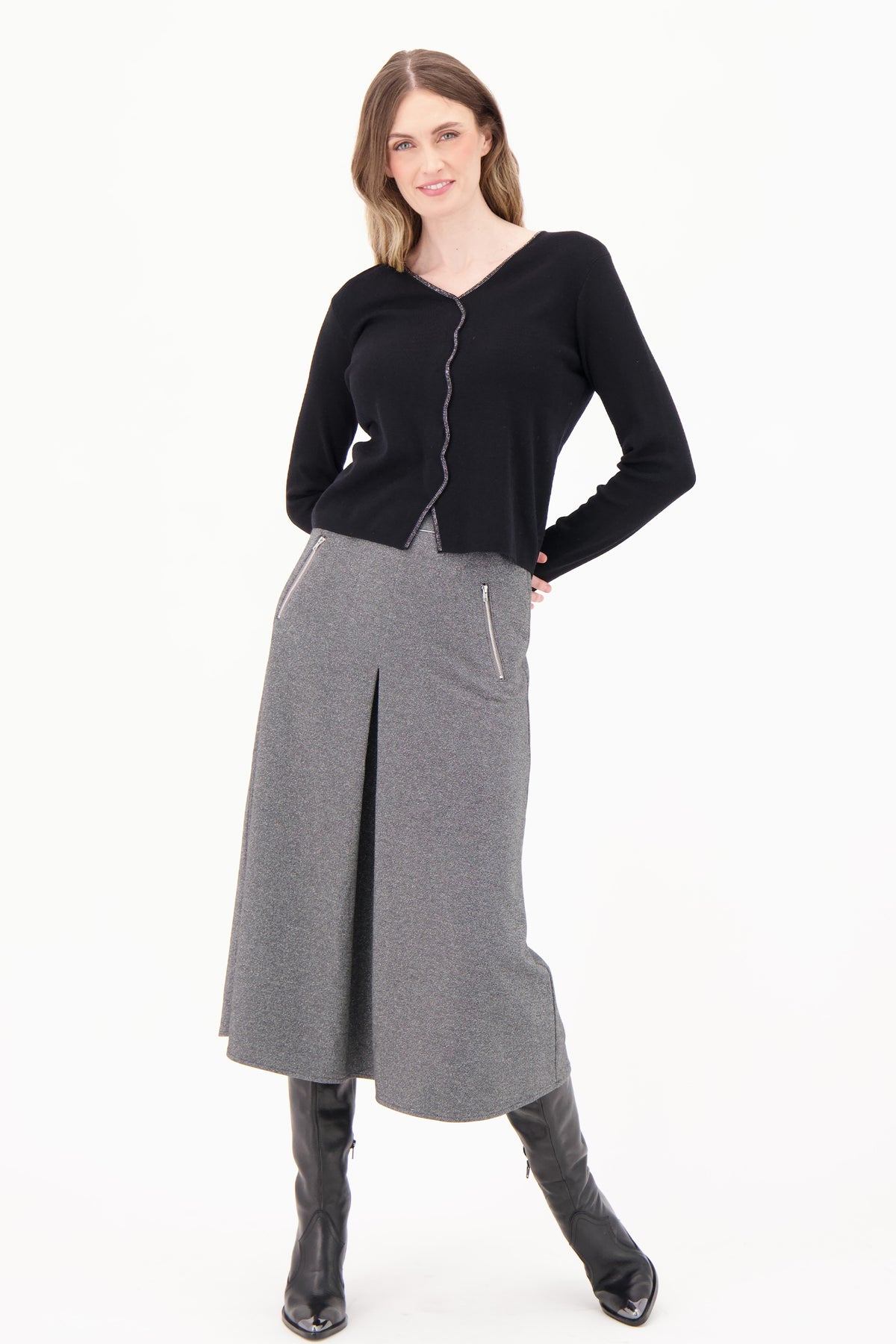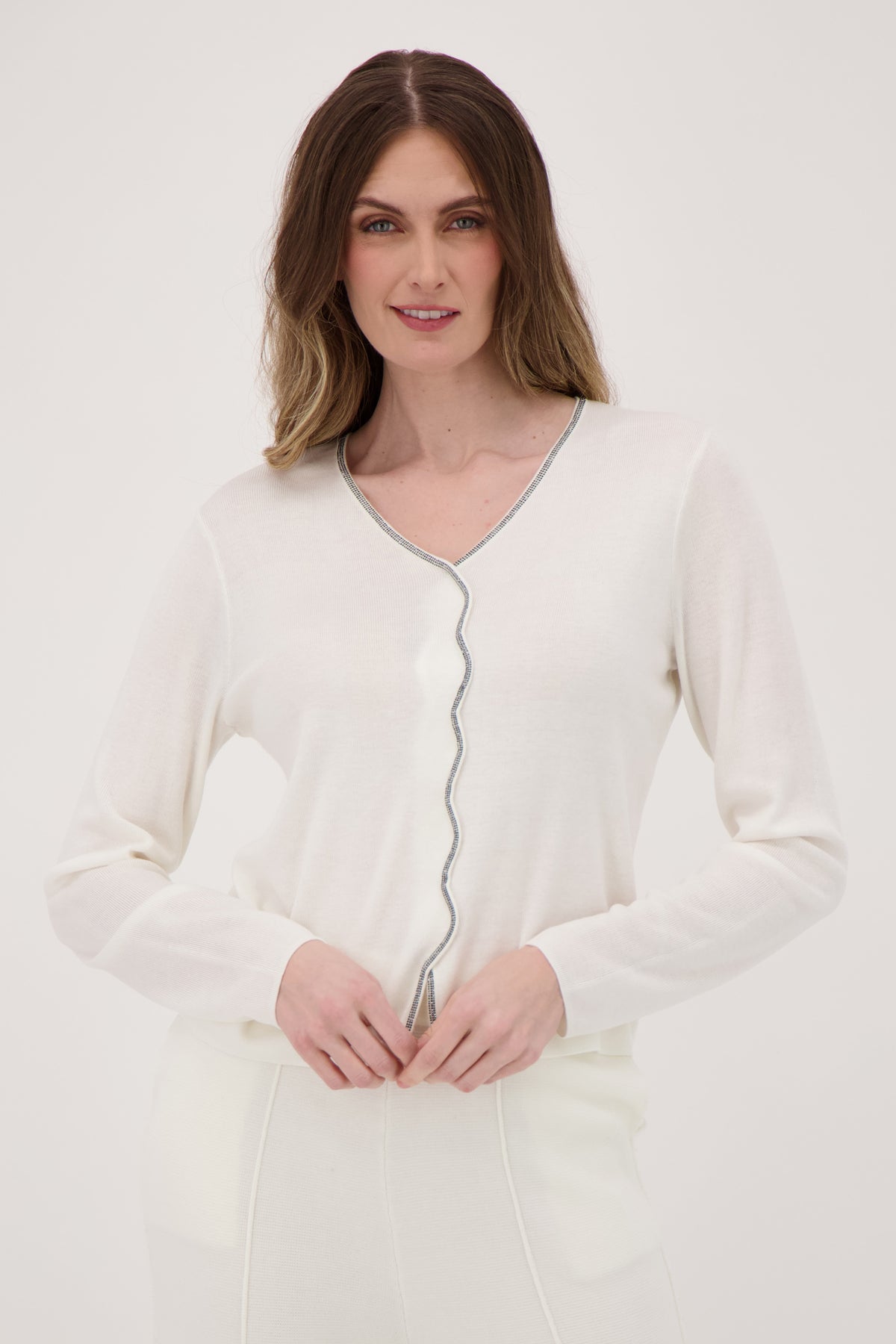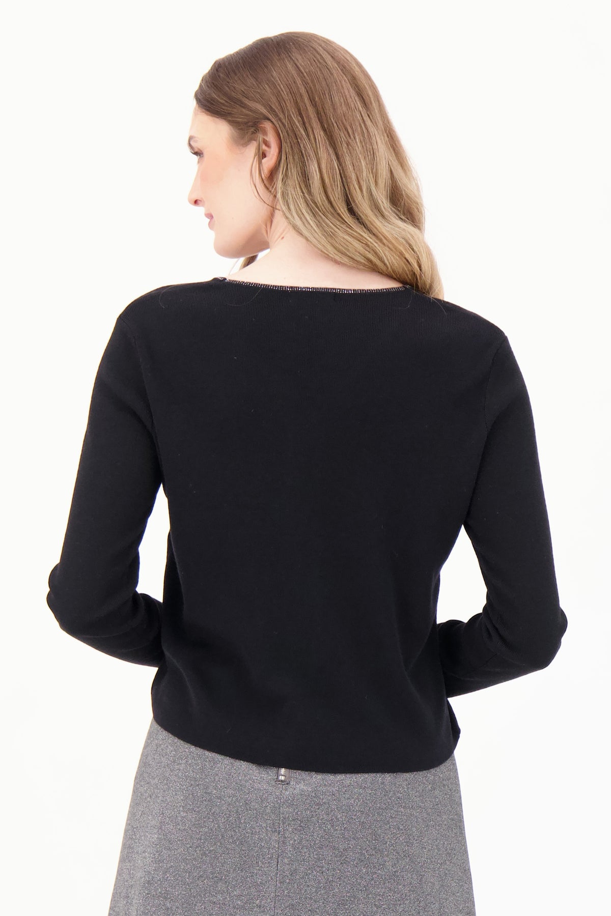 Elevate your look effortlessly with this sequined front sweater featuring a sparkling rhinestone trim along the v-neckline and front seam. Crafted from a stretchy, lightweight fabric blend, it offers a comfortable fit that moves with you. Combining elegance and ease, this cardigan-style piece delivers fancy style without the fuss—perfect for adding a touch of glamour to any outfit.