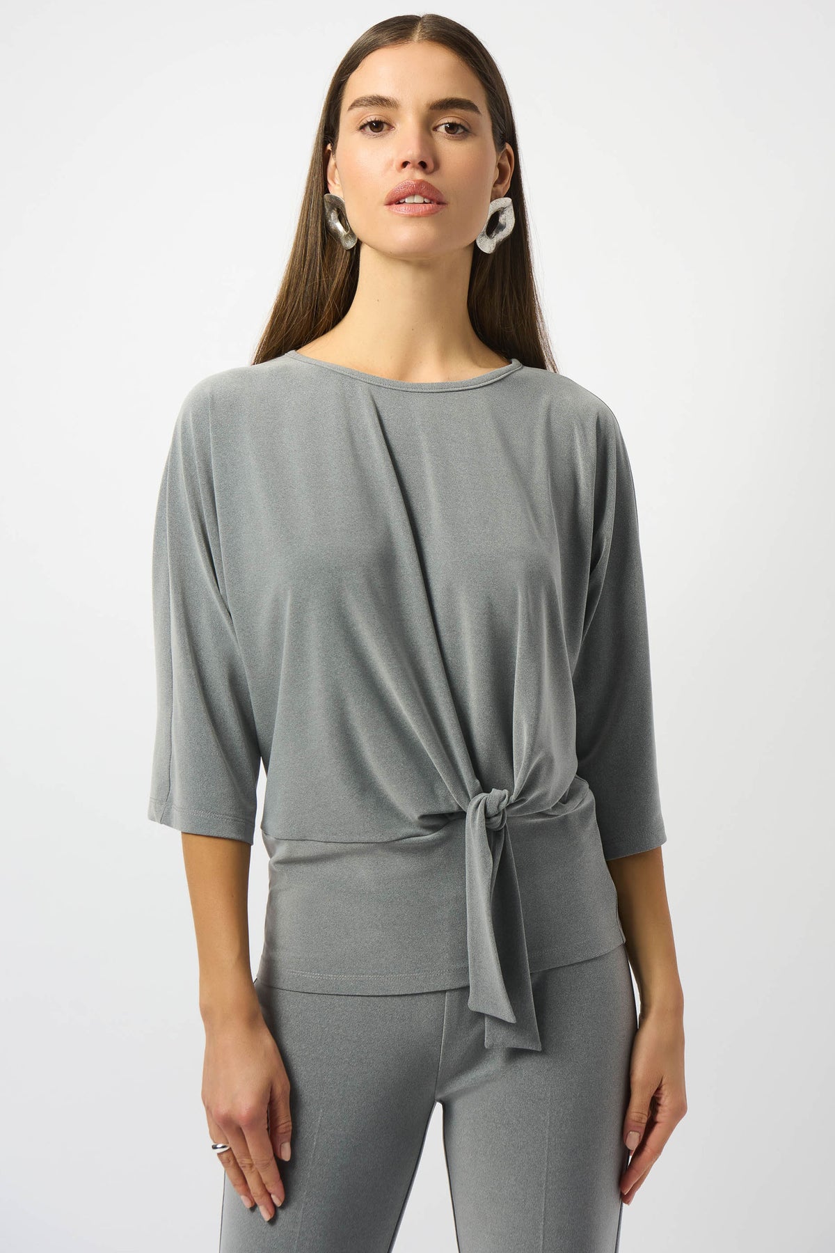 Experience effortless elegance with this Grey Dolman Top featuring a chic front tie knot detail that enhances its luxurious draping. Crafted from silky knit fabric, it offers a soft, smooth touch against the skin. The 3/4 length sleeves and scoop neckline contribute to a relaxed yet refined silhouette, making it perfect for both casual and dressier occasions. Enjoy comfort and style wrapped into one versatile piece.