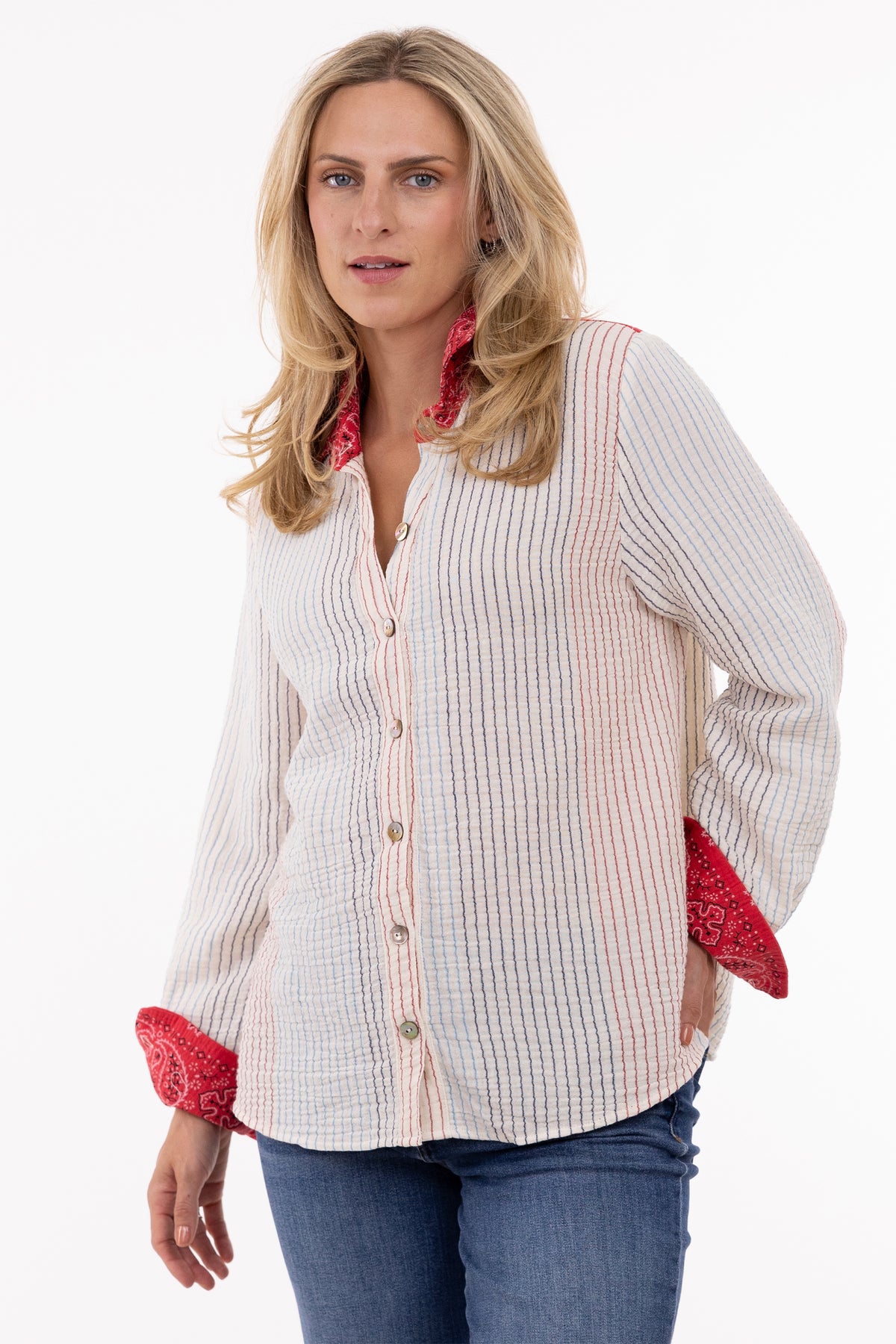 Elevate your casual wardrobe with this charming gauze shirt that blends timeless style with unexpected flair. Crafted from textured woven fabric with a subtle crinkle finish, it delivers that effortlessly polished look perfect for smart casual occasions. The refined pinstripe pattern pairs beautifully with a standout bandana print collar and cuffs—those neat finishing touches that transform a classic piece into something distinctly you. Comfortable, versatile, and just the right amount of personality.