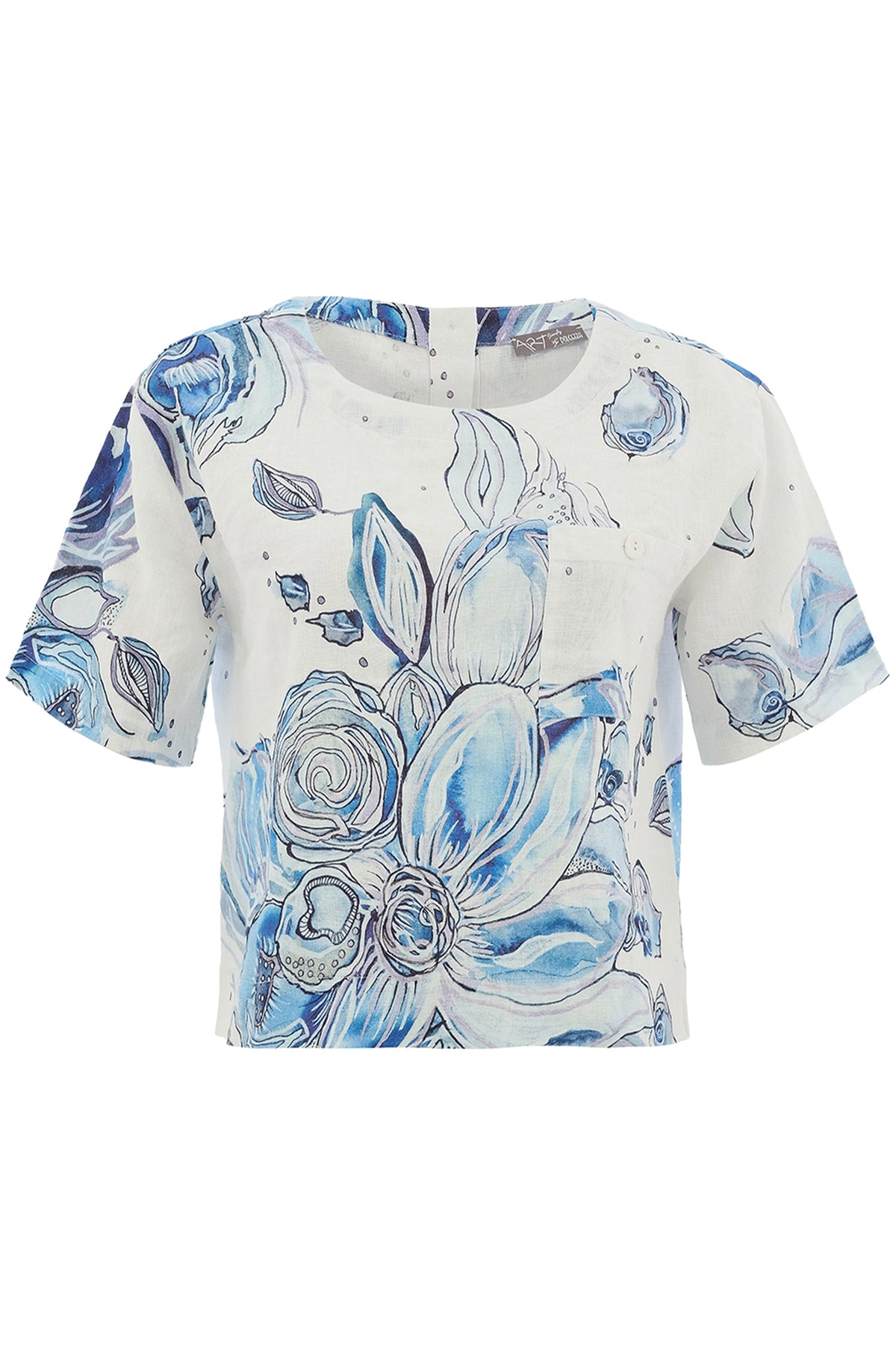 BLUE FLOWERS LINEN SS BUTTON BACK TOP
