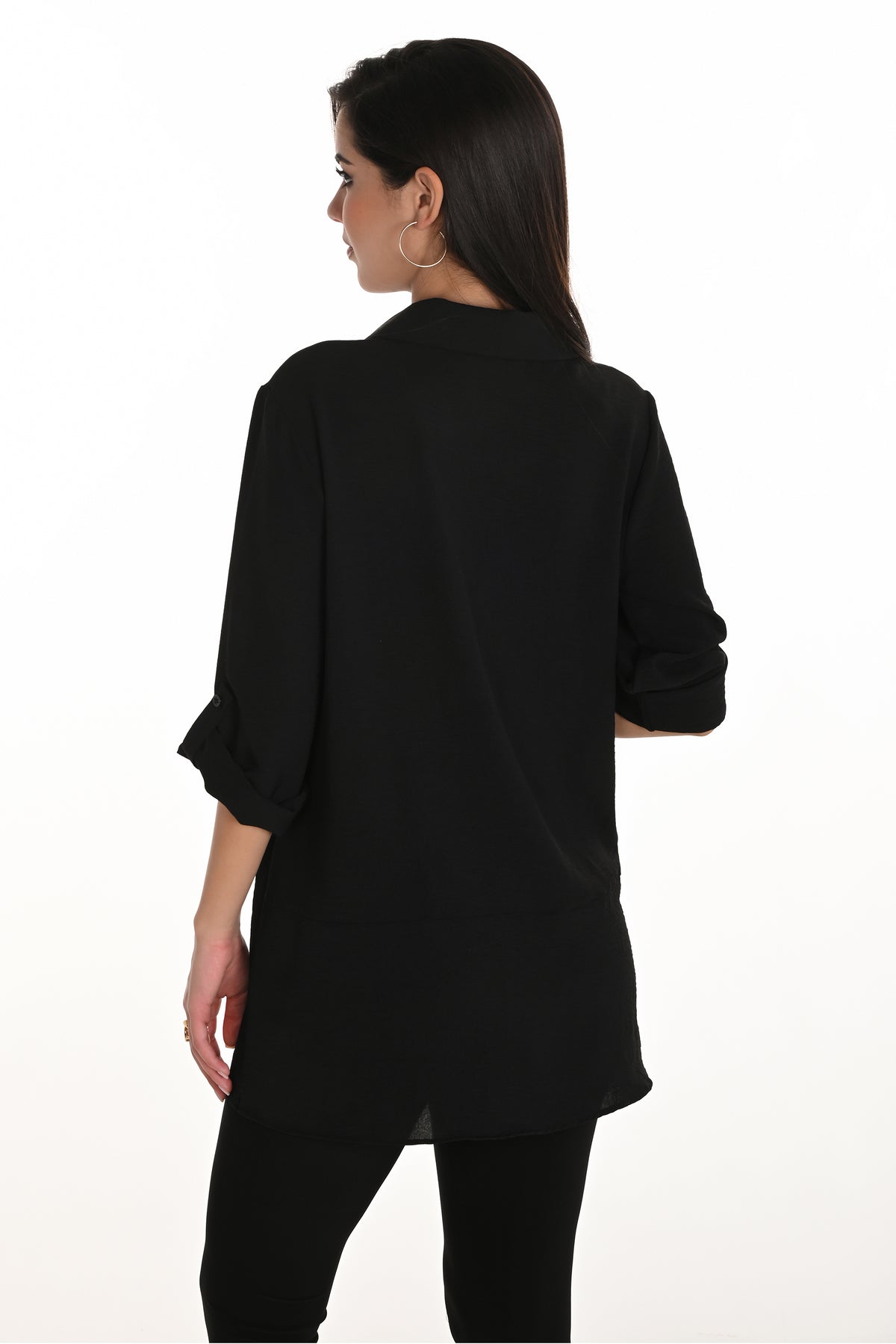 This loose fitting button front tunic blouse is perfect to wear with leggings or jeans an easy outfit to throw together to look chic and stylish. It features rolled 3/4 length sleeves with button tabs, a classic wide collar and an elongated silhouette to make this tunic a staple in your closet.