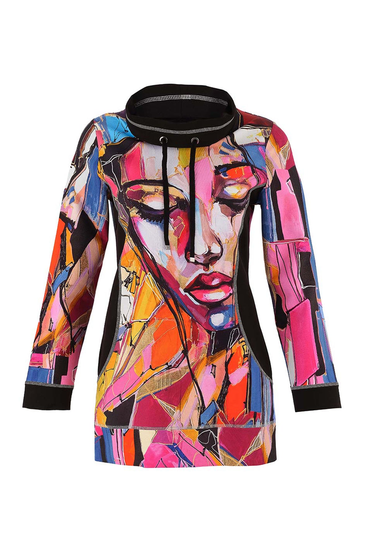 Elevate your wardrobe with the new tunic pullover. Featuring a stylish cowl neck with an adjustable drawstring, it offers a customizable fit that flatters your figure. The contrasting side panel adds a dynamic touch, enhancing the overall silhouette. This light, relaxed tunic showcases a captivating face print that is sure to turn faces and spark conversation wherever you go!
