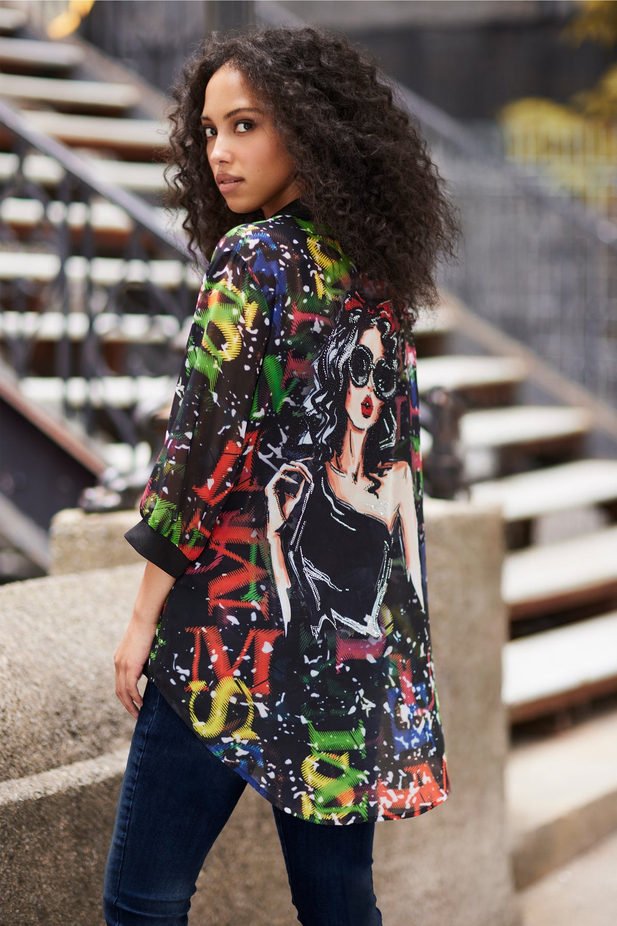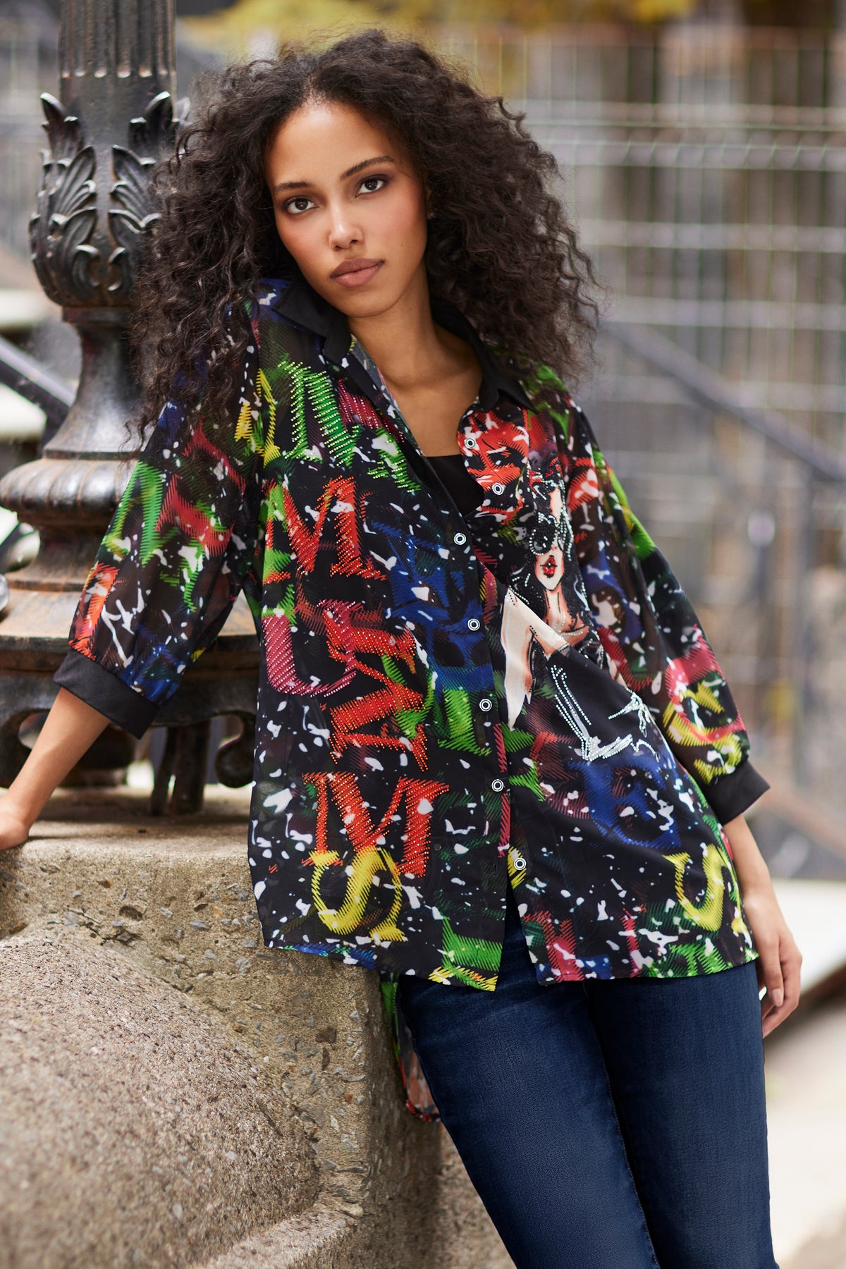 This tunic blouse features a playful cool girl abstract motif on both front and back, paired with a crisp contrast classic collar for a stylish edge. Light and airy, it offers comfort throughout the day. The full front button design and 3/4 roll-up sleeves with button tabs add versatility and ease, perfect for a laid-back yet chic look. Its tunic length makes it ideal for pairing with leggings or skinny jeans, balancing fun and effortless style.