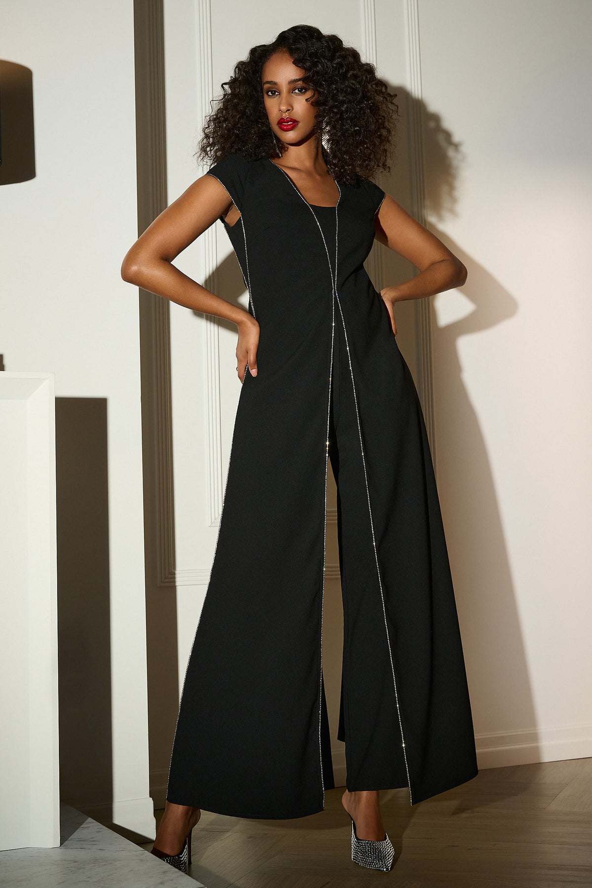 Elevate your evening wardrobe with this sophisticated wide-leg jumpsuit, designed for those who appreciate refined elegance. The scoop neckline frames the face beautifully, while a front-layered silhouette adds dimension and visual interest. Jewel rhinestones cascade along the front and sides, catching light with every movement for a glamorous finishing touch. The flowing wide legs create a flattering, elongated silhouette perfect for formal occasions. A discreet back zipper ensures an effortless fit. Whether attending a gala or upscale event, this statement piece combines timeless style with contemporary flair.