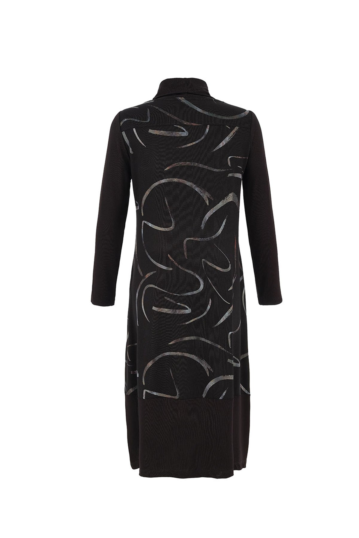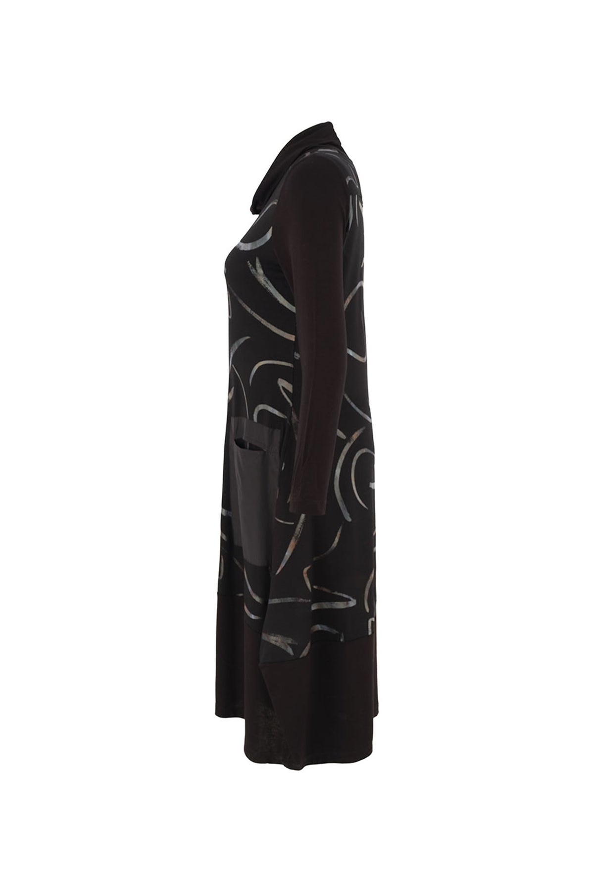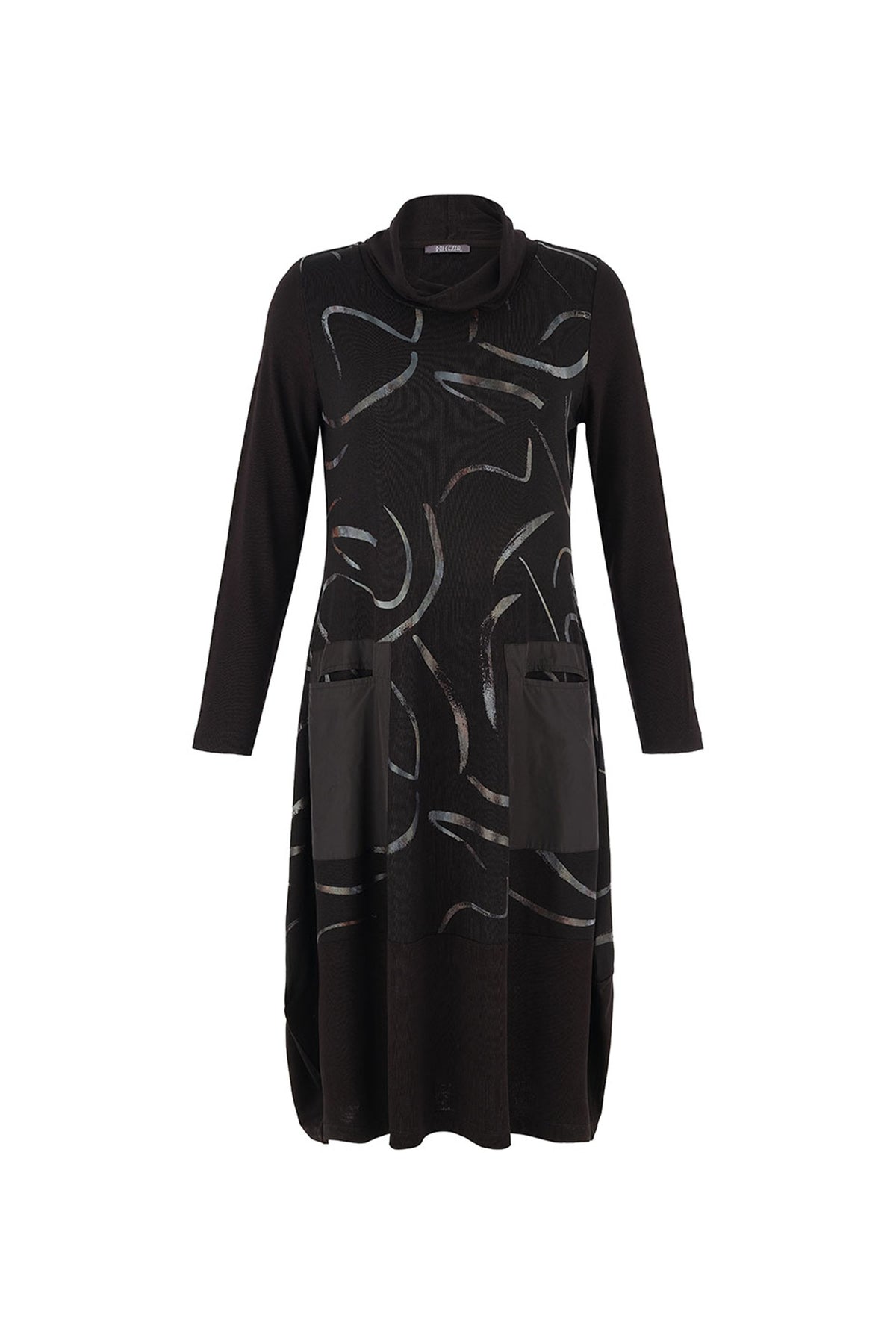 This elegant A-line midi dress blends classic black with subtle light tones for a sophisticated look. Designed with full-length sleeves and a flattering cowl neck, it offers comfort and style for any occasion. The unique front contrast memory pockets add both function and a modern edge to this versatile piece, making it perfect for day-to-night wear.