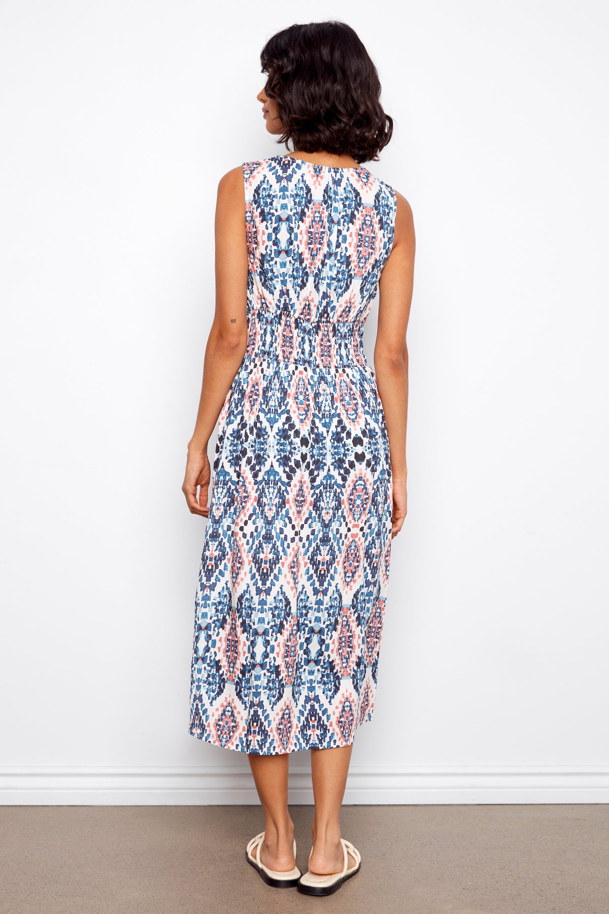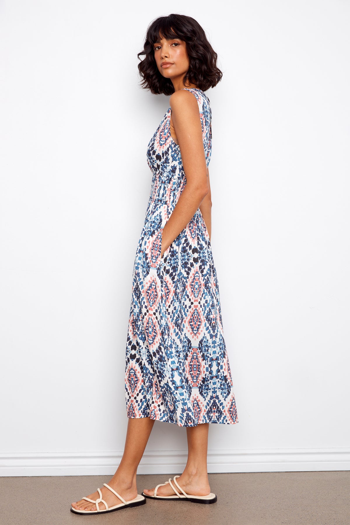 This midi length sleeveless dress is perfect for your next holiday! Its lightweight and airy design will keep you cool and comfortable. The soft cut v-neck and pinched waist adds a touch of elegance. A must-have for any warm weather getaway!