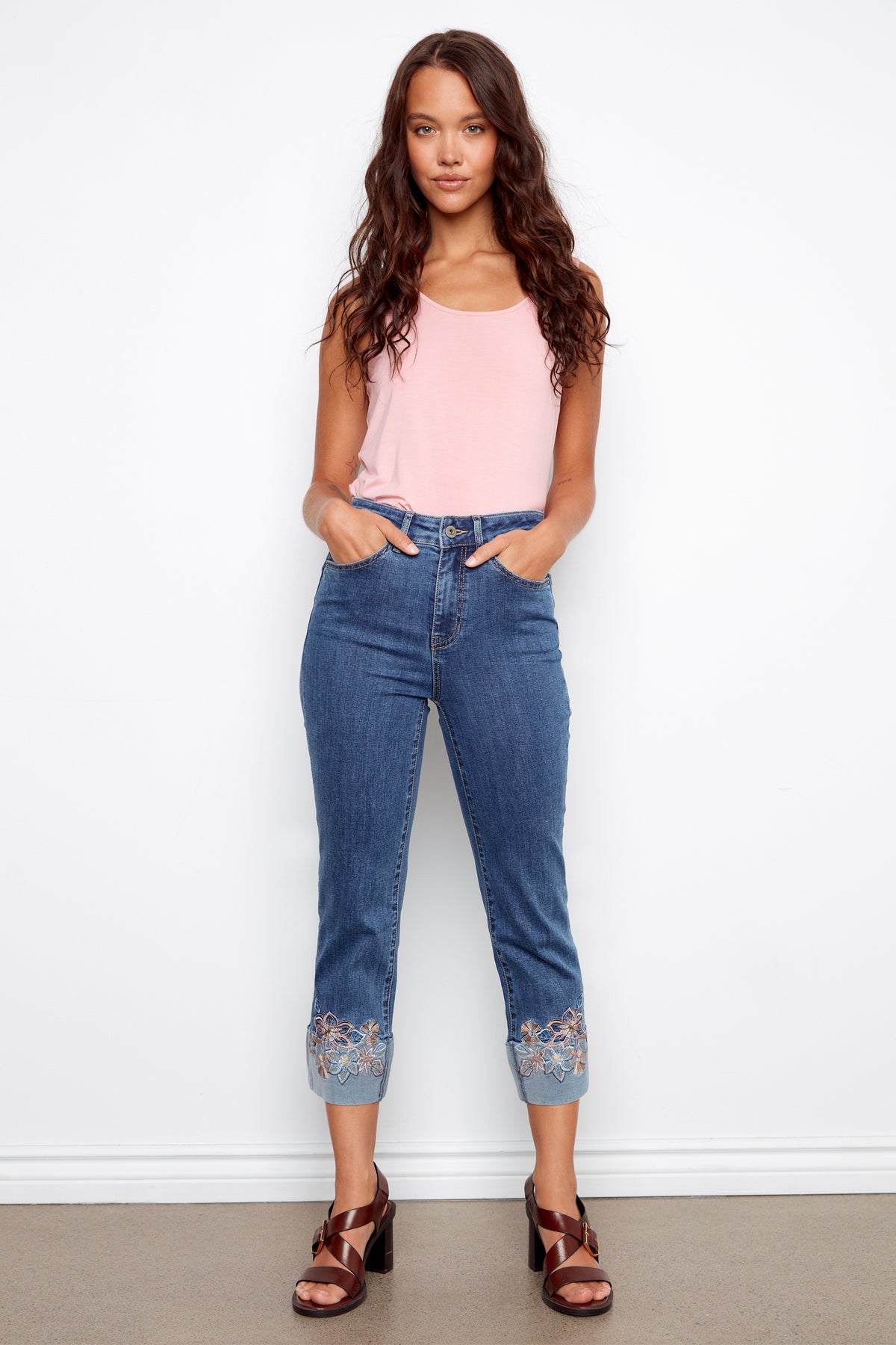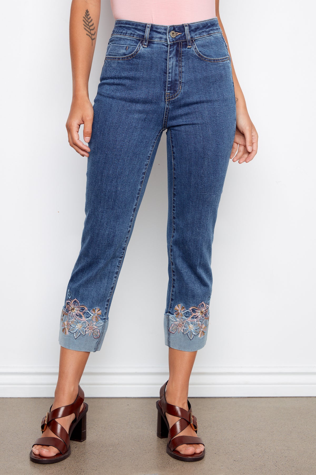 MEDIUM BLUE CROPPED JEAN WITH EMBROIDERED CUFF