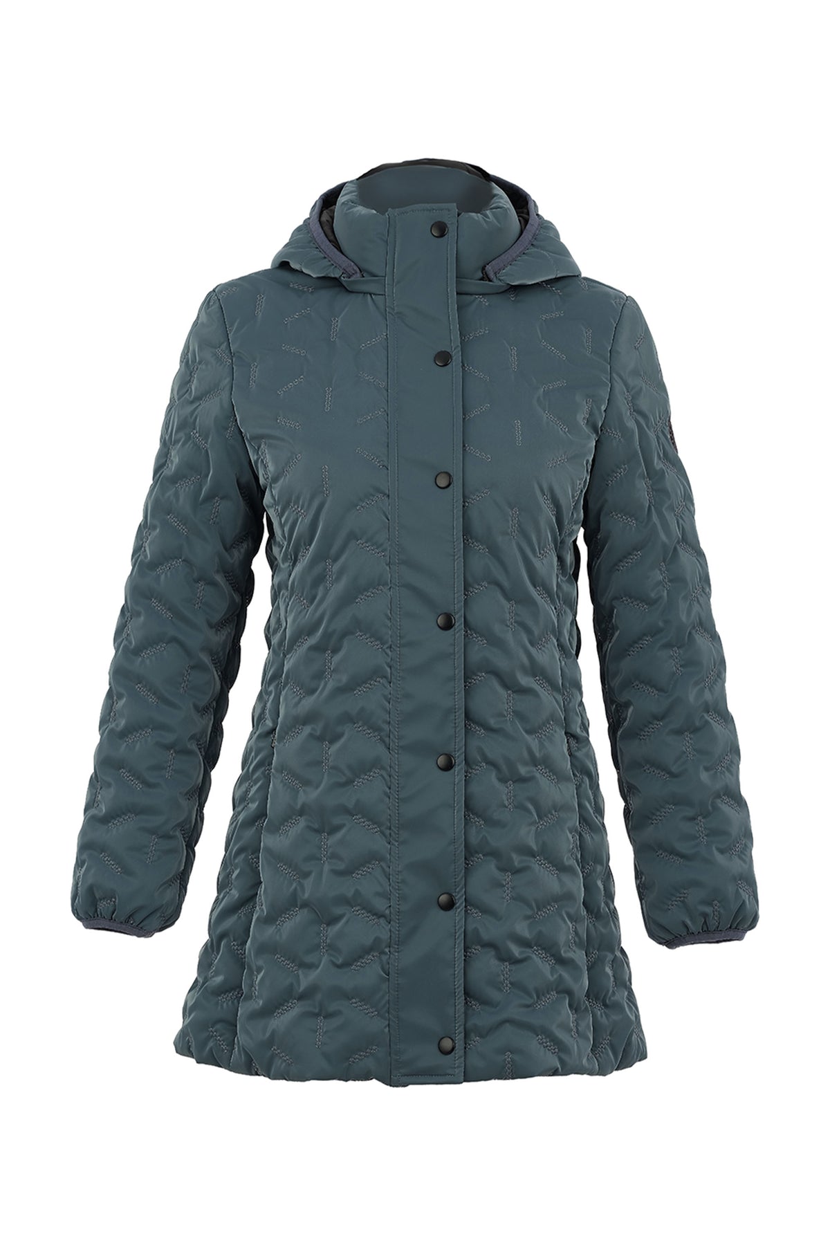 Look sharp in this luxurious quilted coat! Made with a high shine outer material and full-length sleeves, this coat features a front button flap closure with zipper, high neck, front pockets and a detachable hood. Lightly padded for added protection from the elements, you can stay stylish and warm in this Dolcezza classic!
