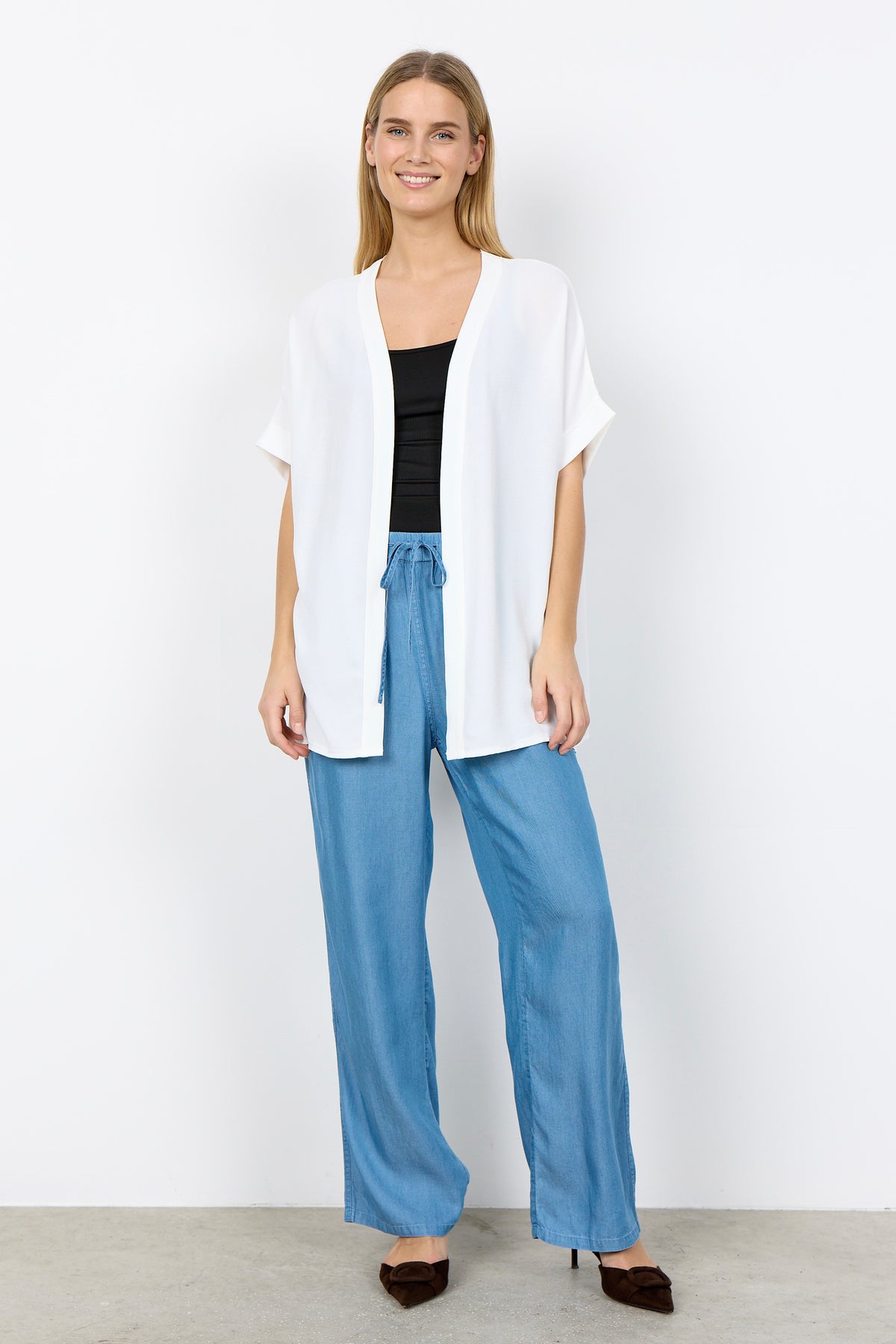 Woman wearing a white cardigan over a black top and blue pants on a white background