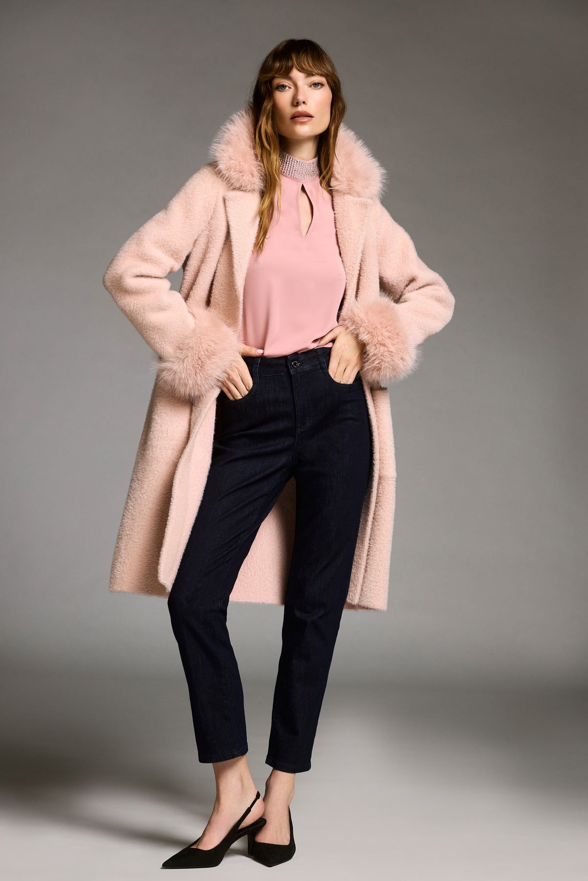 Stay cozy and stylish with our Feather Yarn Coat with Faux Fur. Made with soft feather yarn and a warm faux fur back collar, this sweater knit coat also features convenient side pockets. Perfect for chilly days, it's a must-have addition to your winter wardrobe!