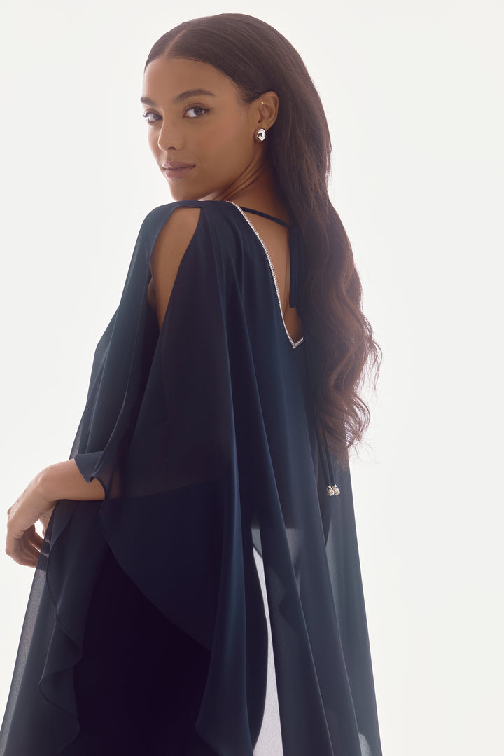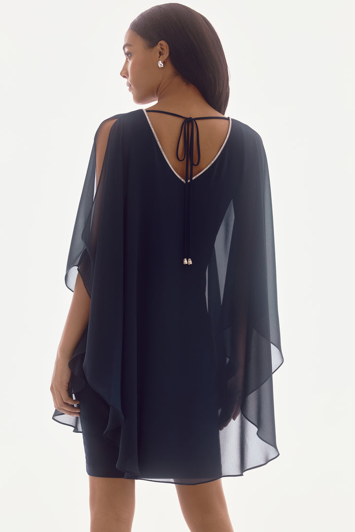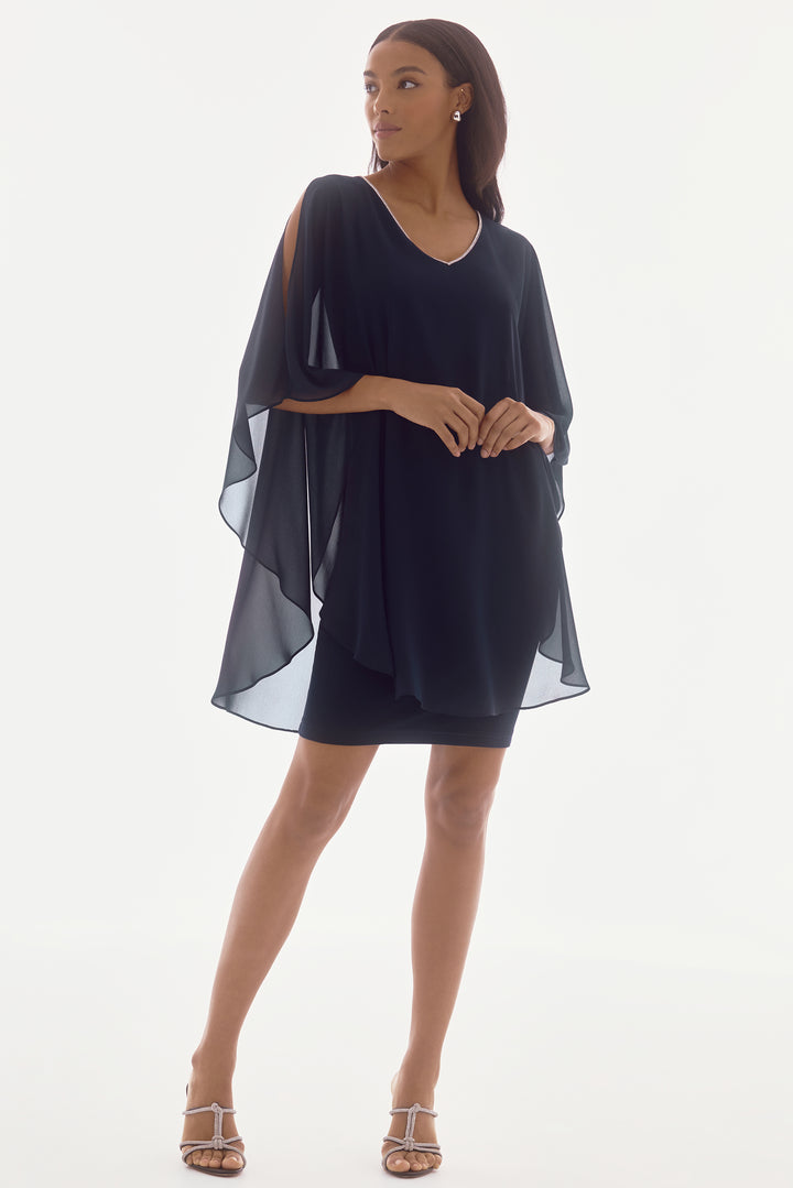 Experience luxury with our Chiffon Overlay Dress with Bling! Crafted from silky knit fabric, this knee length dress features a jewel v-neckline and flare short sleeves. And the chiffon drape? It's the star of the show for your formal night out!