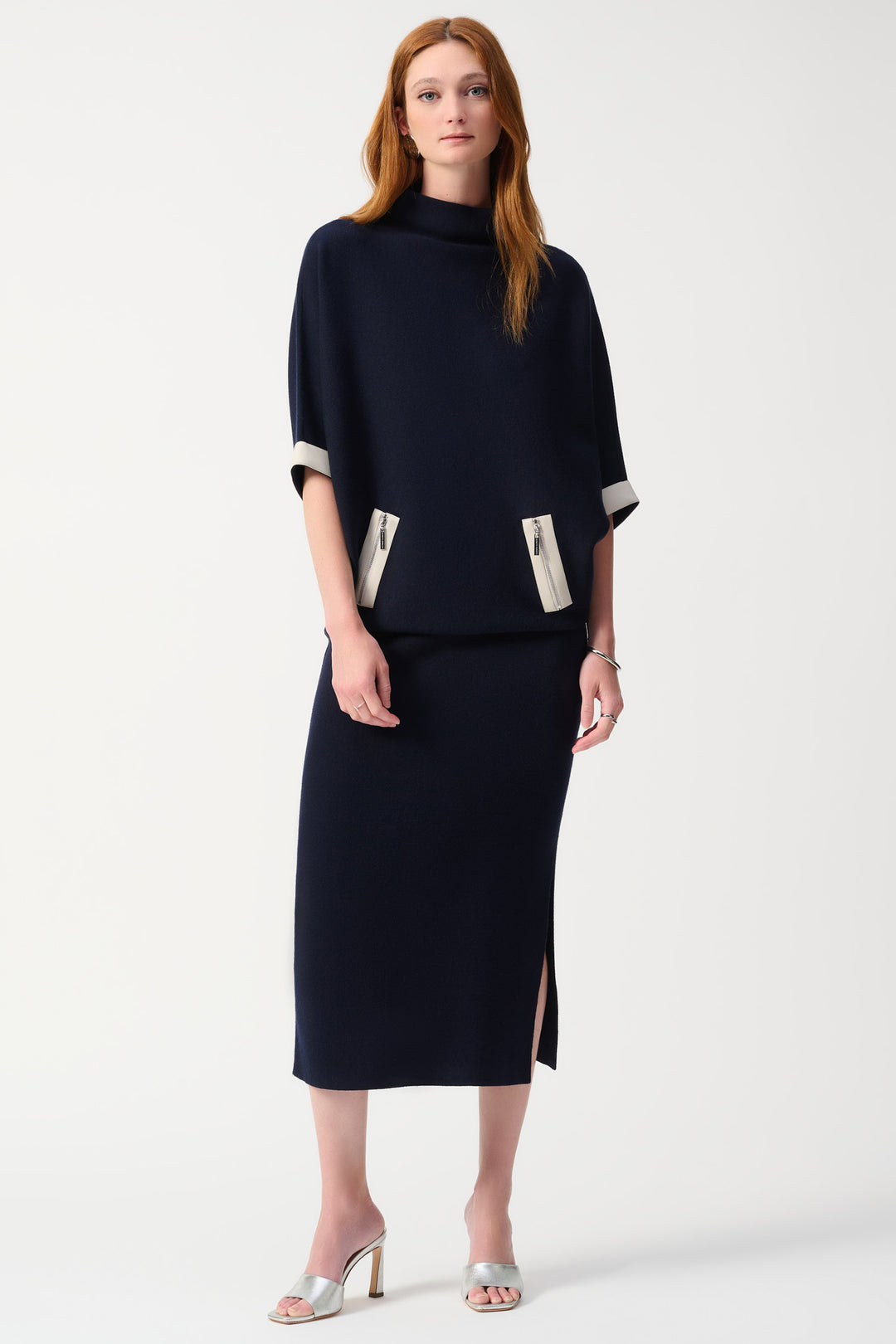 This knit skirt features a high-waist design with elegant side slit cuts that add movement and style. Its midi length and elastic waist ensure both comfort and a flattering fit.