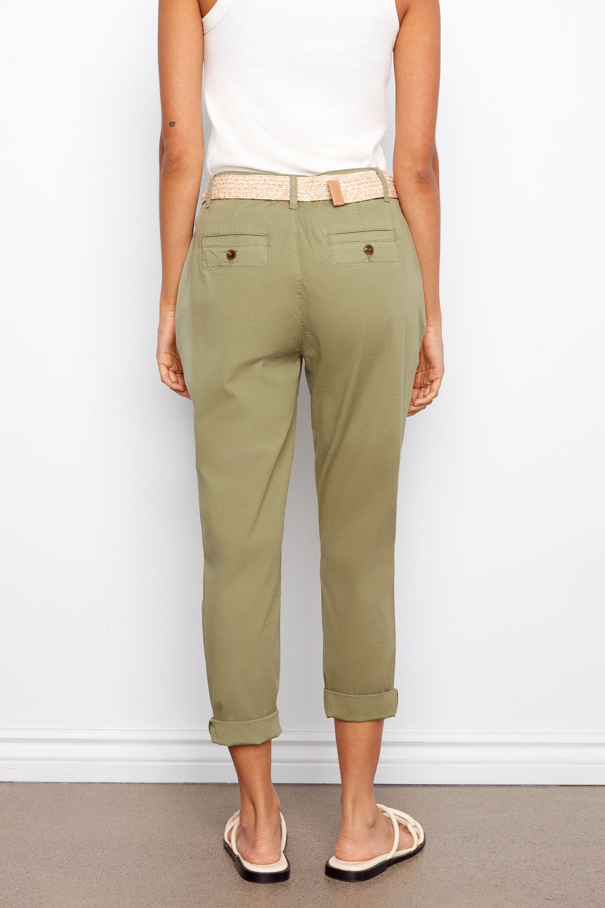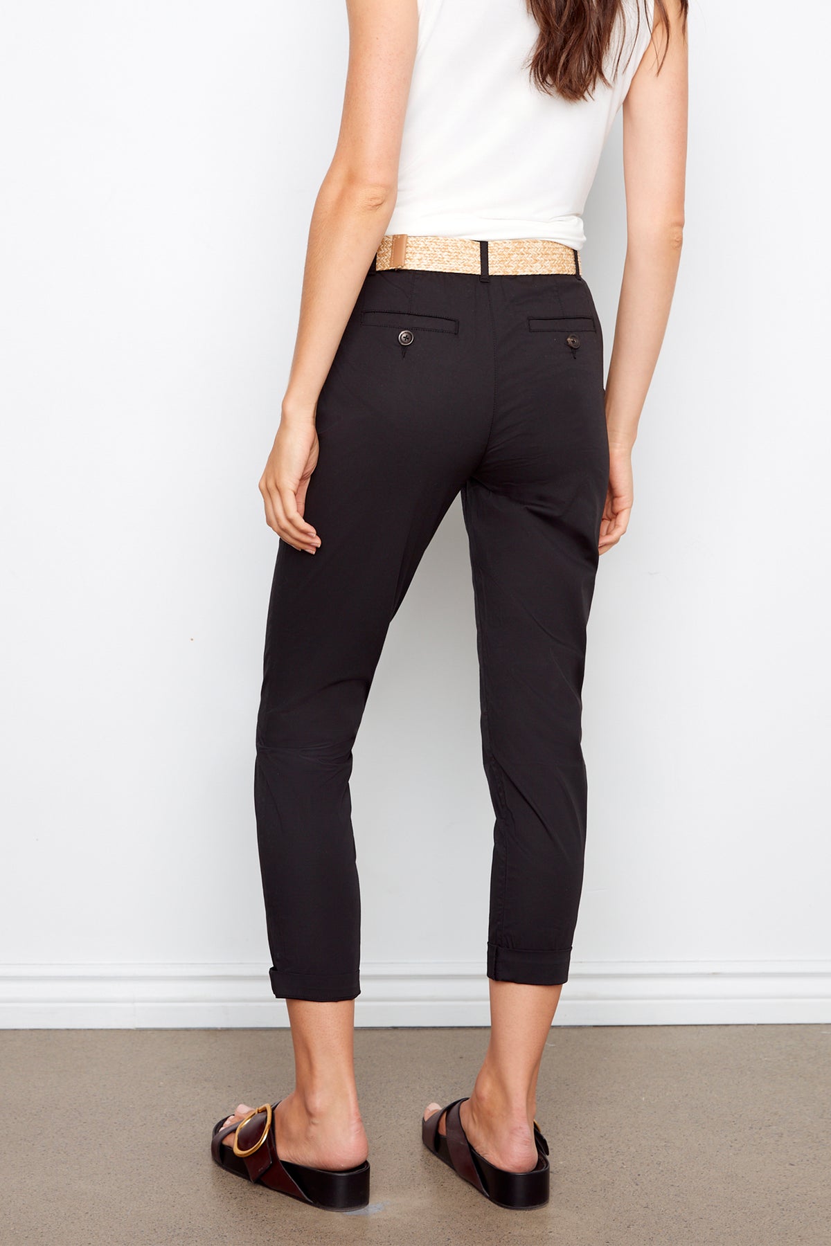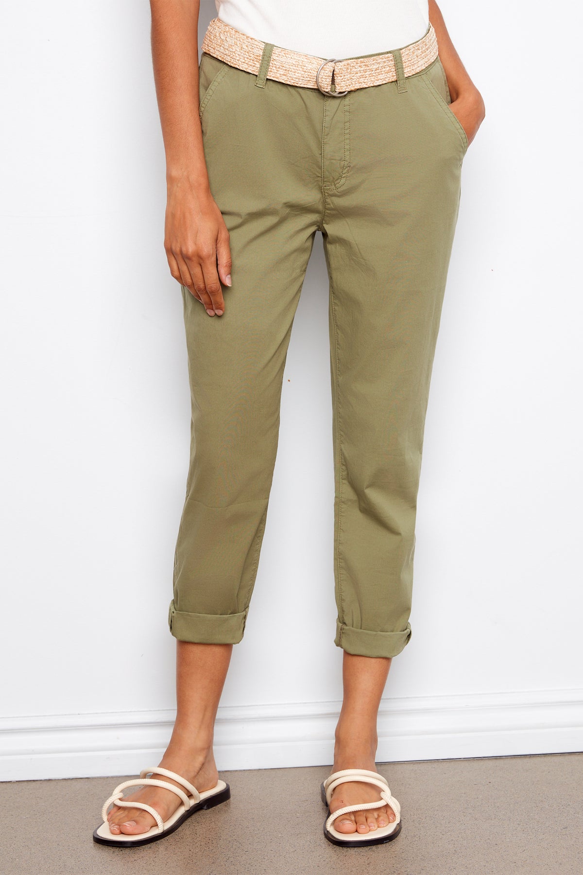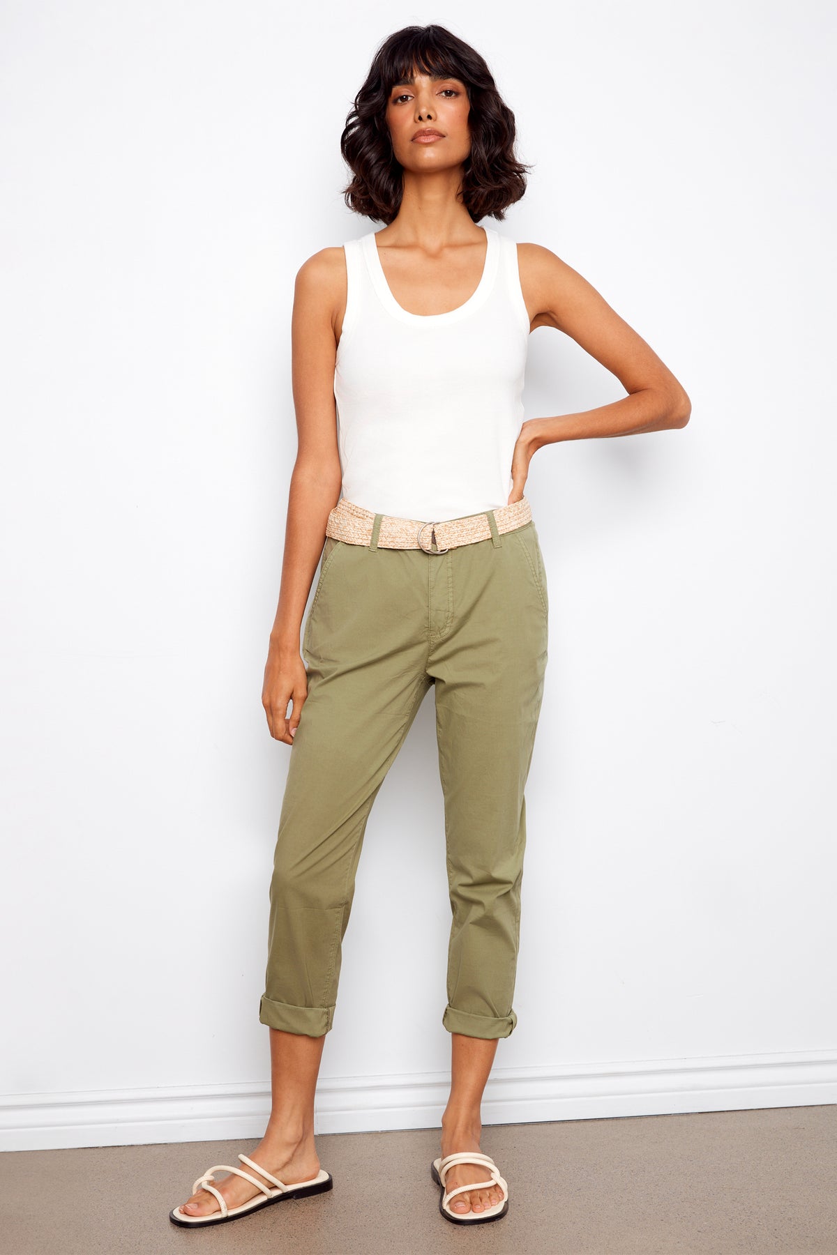 Effortlessly chic, these pants exude confidence with its overall slim fit and narrow leg. Made from a stretch twill fabric, its cotton blend offers comfort and versatility. Complete the look with a tank or blouse and accentuate your style with the included woven belt and cuffed roll-up hems.
