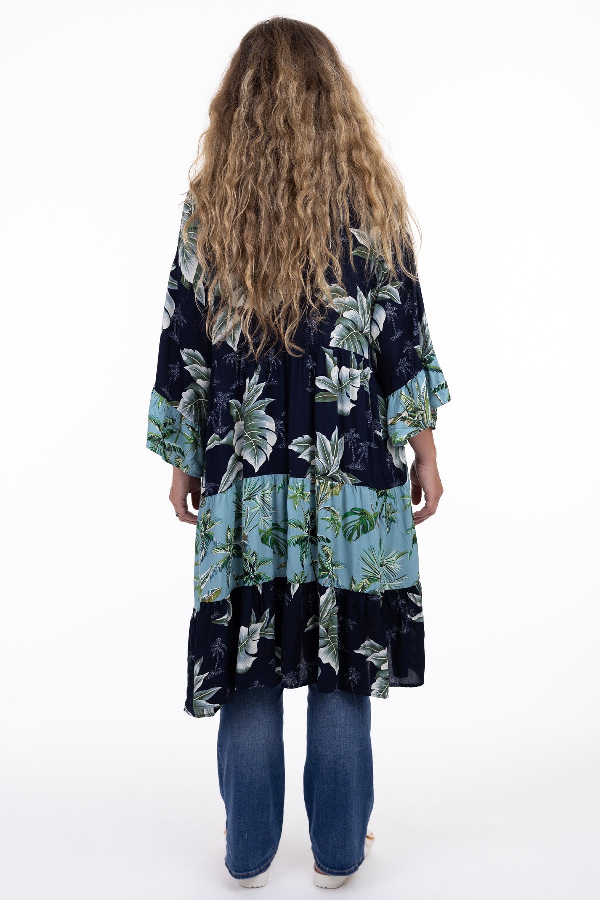 Slip into effortless style with our long contrast cardi, kimono style—a playful take on traditional design that's anything but ordinary. Crafted from all rayon in a lightweight fabric, this open-front beauty drapes loosely for maximum comfort and breathability below the knee. Vibrant contrast denim bandana trims frame the edges while the vibrant palm print stands out from any crowd! Perfect for layering under a light top, it's an eco-conscious choice that celebrates individuality with every wear!