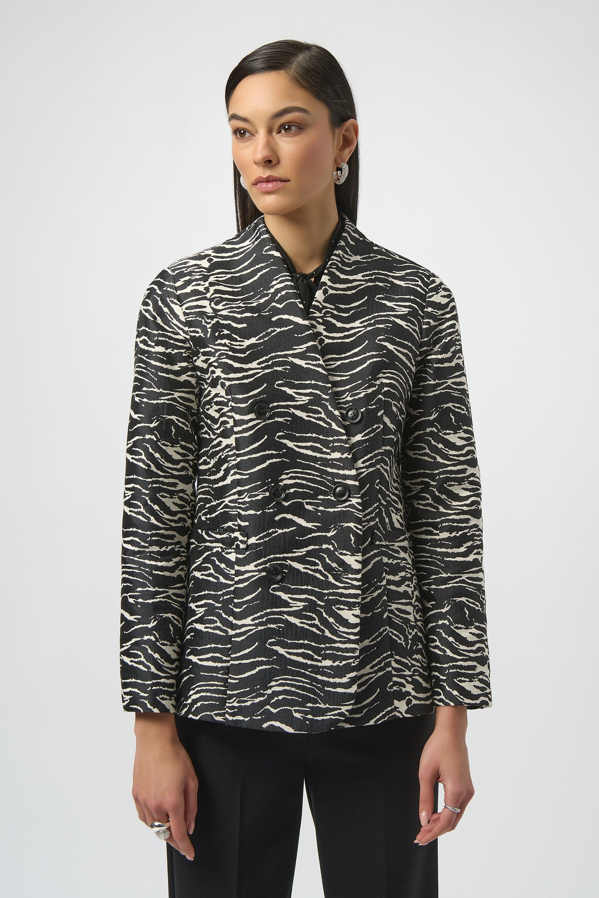 Make a statement with this sophisticated cotton blend jacket, featuring a striking animal print jacquard weave. The blazer-inspired silhouette showcases a natural V-neckline, double-breasted button closure and faux welt pockets for polished everyday wear. Lightweight and unlined for breathable comfort, it pairs full-length straight sleeves with a refined cut that transitions effortlessly from office to evening occasions.