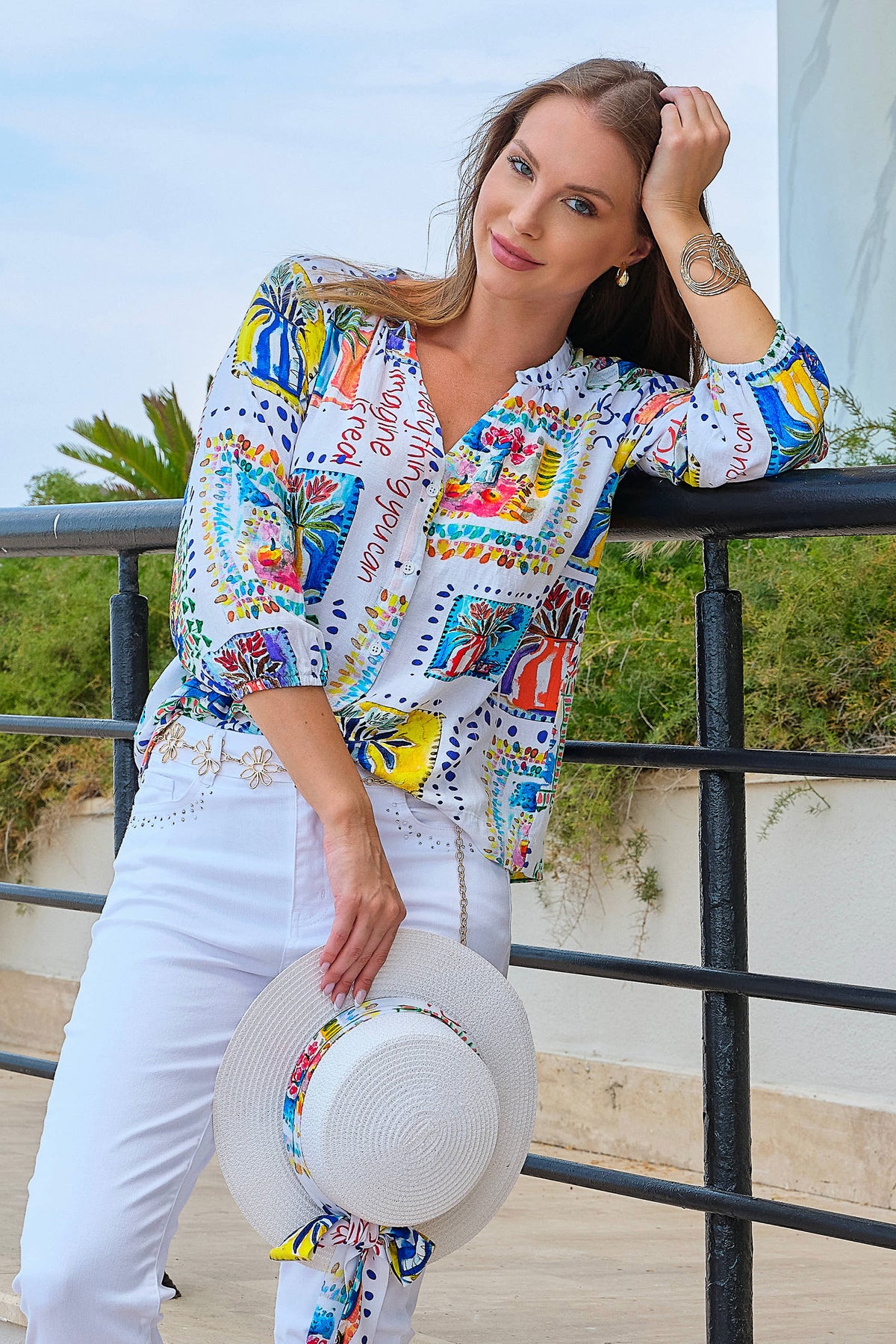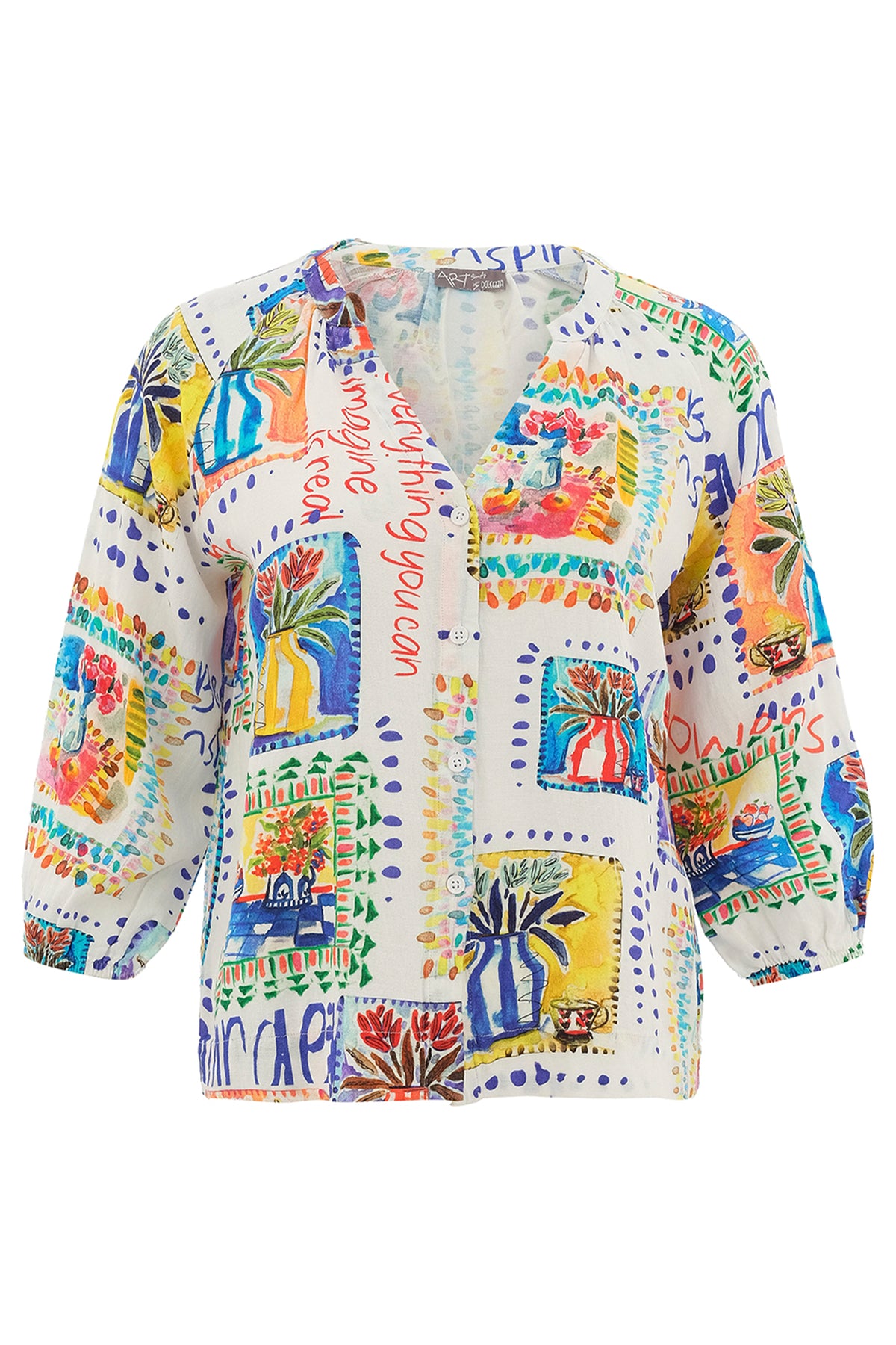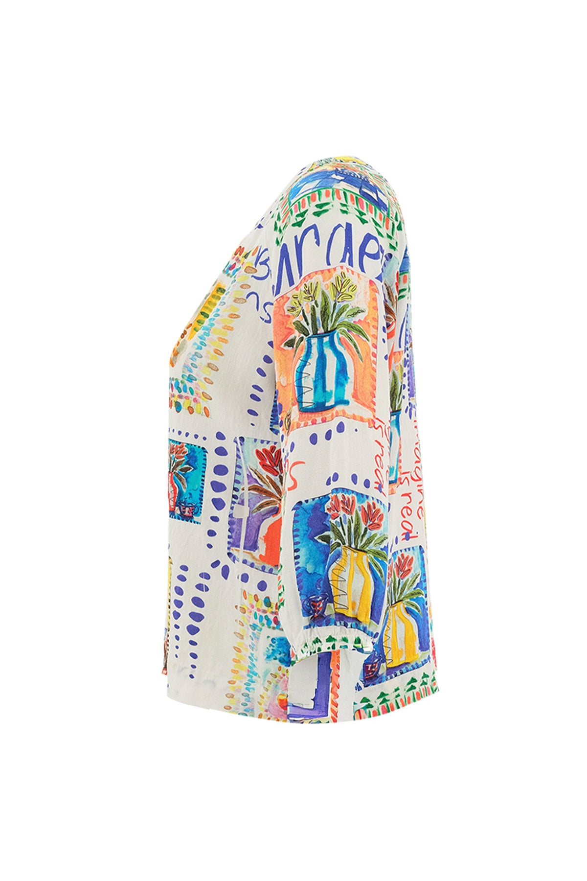 Crafted from a breathable viscose and linen blend, this blouse delivers effortless elegance with its relaxed silhouette and flowing 3/4 sleeves. The open split neck creates a flattering neckline, while the all-over vase flowers print adds botanical charm to your everyday wardrobe. Light and loose throughout, it's designed for comfort without compromising on style—perfect for warm weather layering or standalone wear.