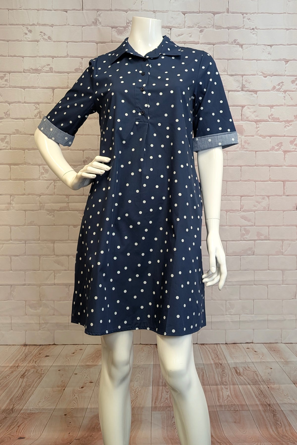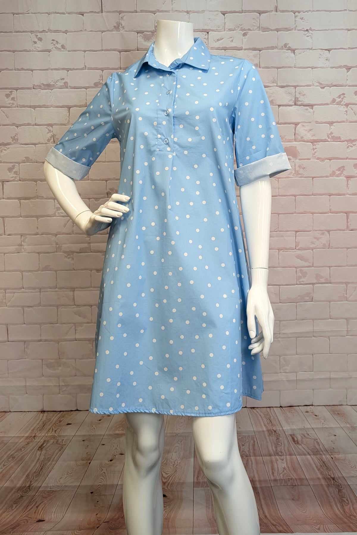 Neatly patterned with adorable polka dots, this classic dress features a neat stitched collar and four front buttons for timeless charm. Roll up them short sleeves for an extra cute touch! Perfect for adding a dash of fun to your everyday summer style!