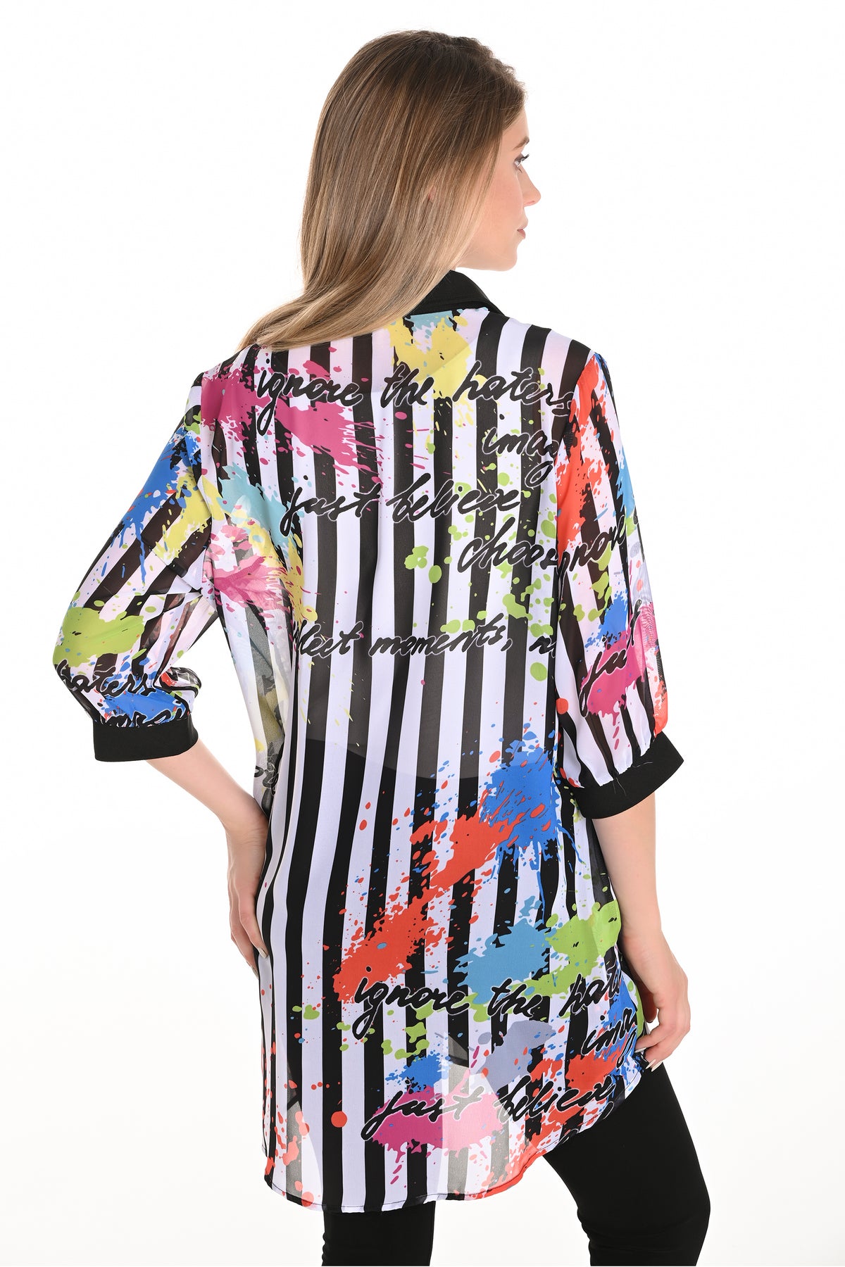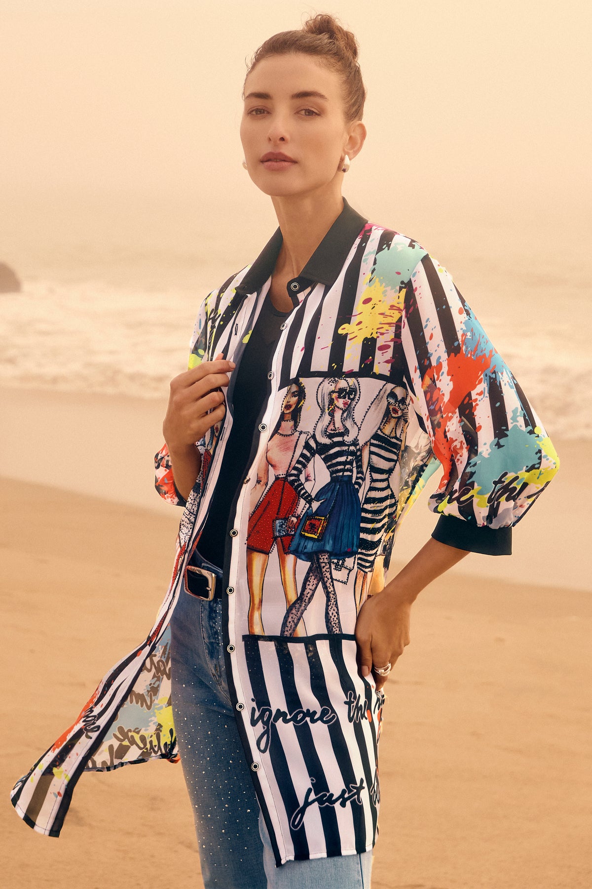 Add some playful style to your wardrobe with this tunic length blouse. The 3/4 length straight sleeves and front buttons keep you comfortable and stylish. Made with a light, loose woven fabric, this blouse features bold black stripes contrasted with a fun fashionistas print!